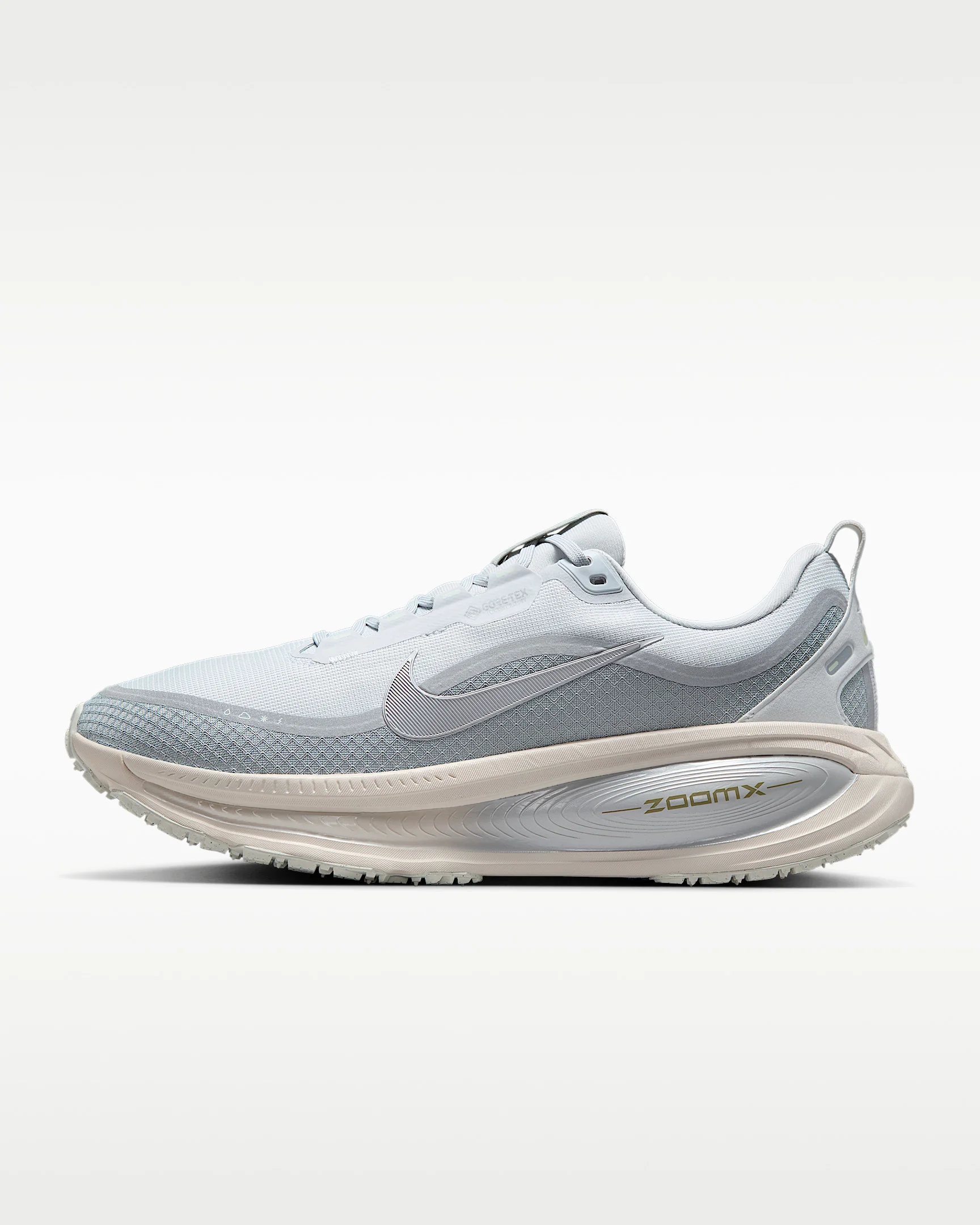 Maximum cushioning in the winterized Vomero 18 delivers a comfortable ride for rainy road runs. Experience optimal comfort with lightweight ZoomX foam stacked on top of responsive ReactX foam in the midsole. Plus, a waterproof GORE-TEX upper and reflective details throughout help you comfortably take on the elements. More Benefits - Waterproof GORE-TEX liner and mesh upper - ZoomX foam stacked on top of ReactX foam - Higher stack height compared to Vomero 17 - 13% more responsive than previous React technology Product Details - Reflective details on upper - Not intended for use as Personal Protective Equipment (PPE) - Weight: Approx. 329g/9 oz (Men's US 10) - Heel-to-toe drop: 10mm - Shown: Pure Platinum/Light Pumice/Barely Green/Metallic Silver - Style: HQ7001-003