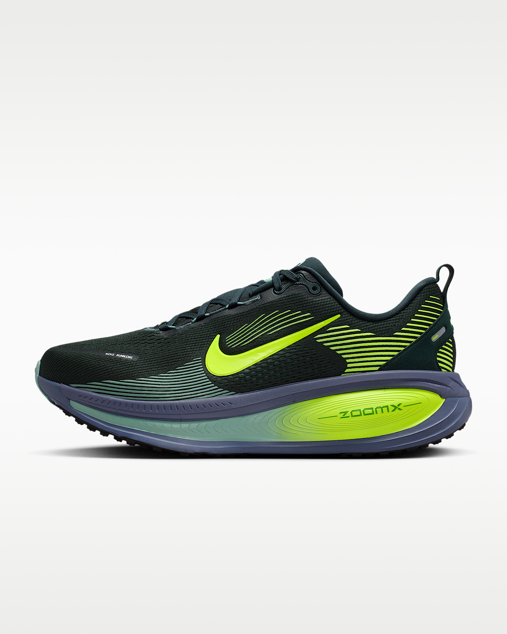 Maximum cushioning in the Vomero provides a comfortable ride for everyday runs. Our softest, most cushioned ride has lightweight ZoomX foam stacked on top of responsive ReactX foam in the midsole. Plus, a redesigned traction pattern offers a smooth heel-to-toe transition. Product Details - Weight: Approx. 325g/11.5oz (Men's US 10) - Heel-to-toe drop: 10mm - MR-10 Last - Our best, most consistent fit - Not intended for use as Personal Protective Equipment (PPE) - Shown: Seaweed/Cannon/Sanded Purple/Volt - Style: IF0514-300