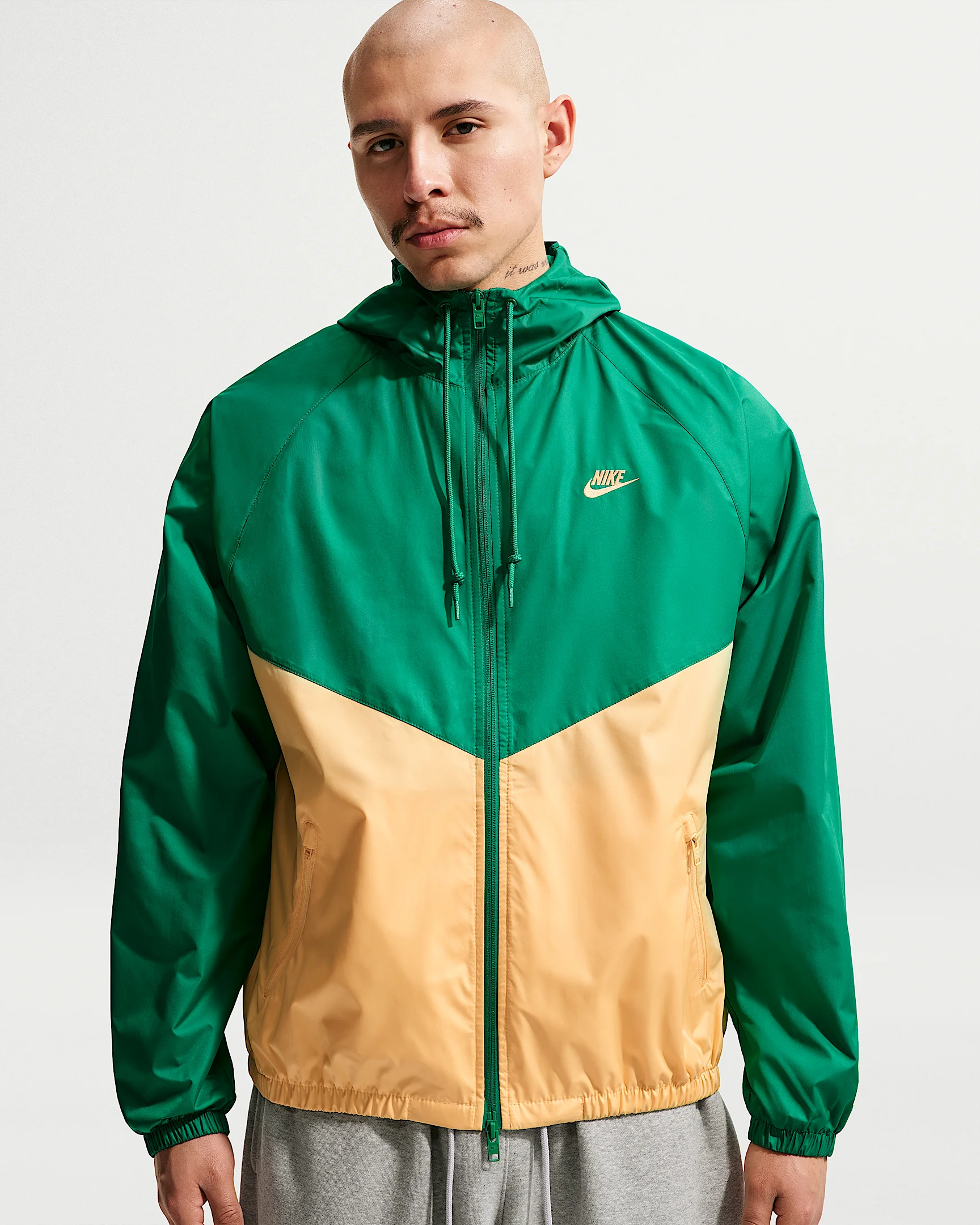 Heritage style meets weather-ready tech. This Windrunner jacket is crafted with a crisp, woven taffeta fabric that's finished with Nike Storm-FIT tech to help resist wind and rain. A mesh lining and rear vent offer a breathable feel while a roomy fit makes it the perfect layering piece. Benefits - Nike Storm-FIT technology resists elements like wind and water to help keep you comfortable in harsh weather conditions. - Chevron design lines are inspired by the Windrunner track jacket from 1978, which is defined by its single and deceptively simple design cue. Product Details - Embroidered logo - Internal Windrunner storytelling label - Two-way zipper - Hood with drawcord - Zippered hand pockets - Elastic hem and cuffs - Body: 100% polyester. Lining: 100% polyester. - Machine wash - Imported - Shown: Malachite/Topaz Gold/Topaz Gold - Style: HV8369-366 SIZE & FIT Model is wearing size M and is 5′11″180cm Loose fit: roomy and relaxed