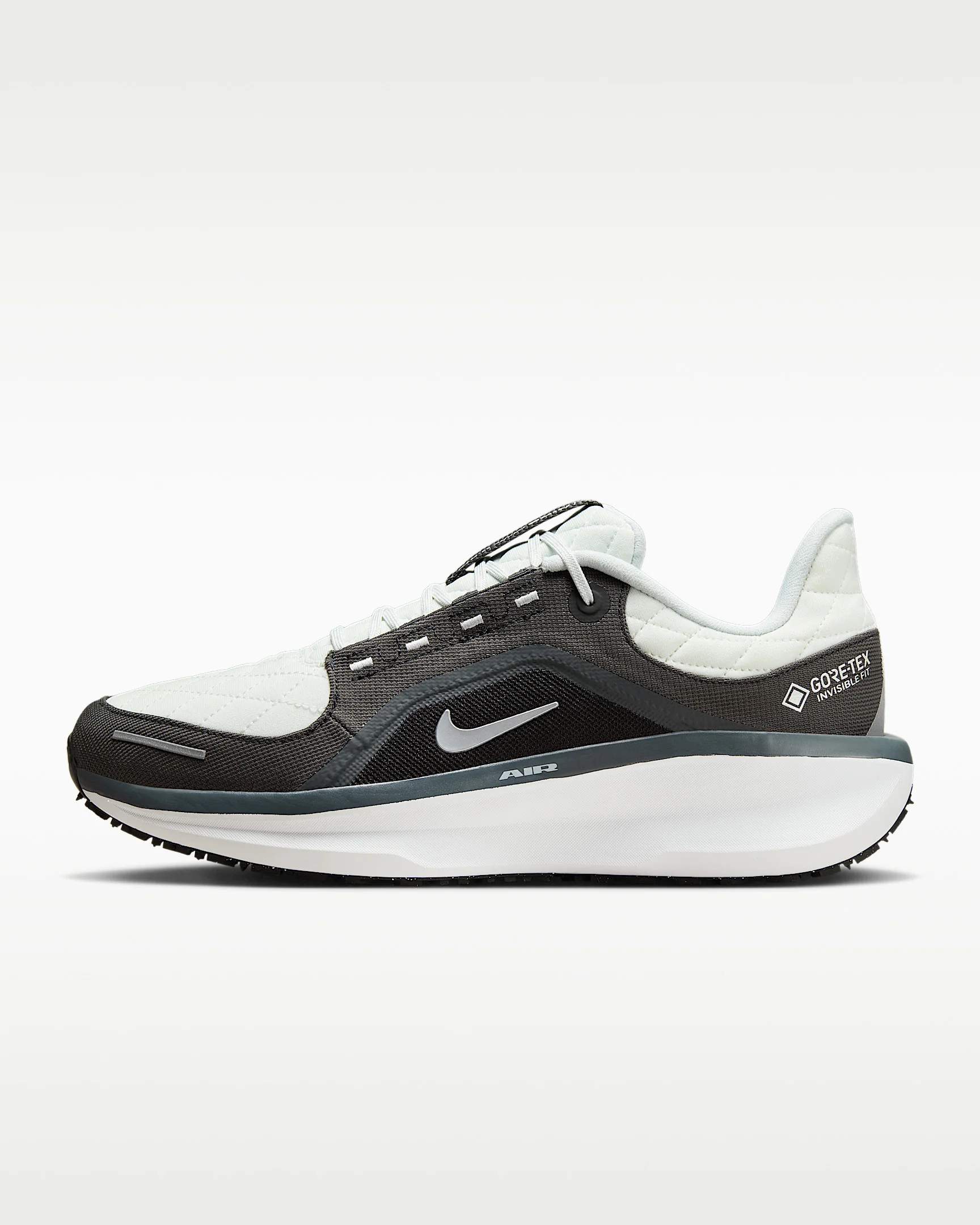 With a waterproof GORE-TEX upper and reflective details, this winterized Winflo 11 provides a balanced ride for wet-weather runs. Experience energy return with a combination of Cushlon 3.0 foam and a full-length Nike Air unit in the midsole. Plus, an elastic midfoot band and spacious forefoot provide an accommodating, comfortable fit. Benefits - Waterproof GORE-TEX upper helps keep water out so your feet dry. - Cushlon 3.0 foam midsole with a full-length Nike Air unit - Rubber waffle-inspired outsole for reliable traction - Heathered material around the collar helps keep your ankle warm. - Elastic midfoot band to accommodate a variety of fits and activities - What’s New? A spacious forefoot, wider heel and even better breathability. Product Details - Reflective Swoosh logos and heel graphic - Weight: Approx. 325 g/11.4 oz (Men’s US 10) - Heel-to-toe drop: 10 mm - MR-10 Last - Our best, most consistent fit - Not intended for use as Personal Protective Equipment (PPE) - Shown: Anthracite/Black/Photon Dust/Metallic Silver - Style: FQ1358-004