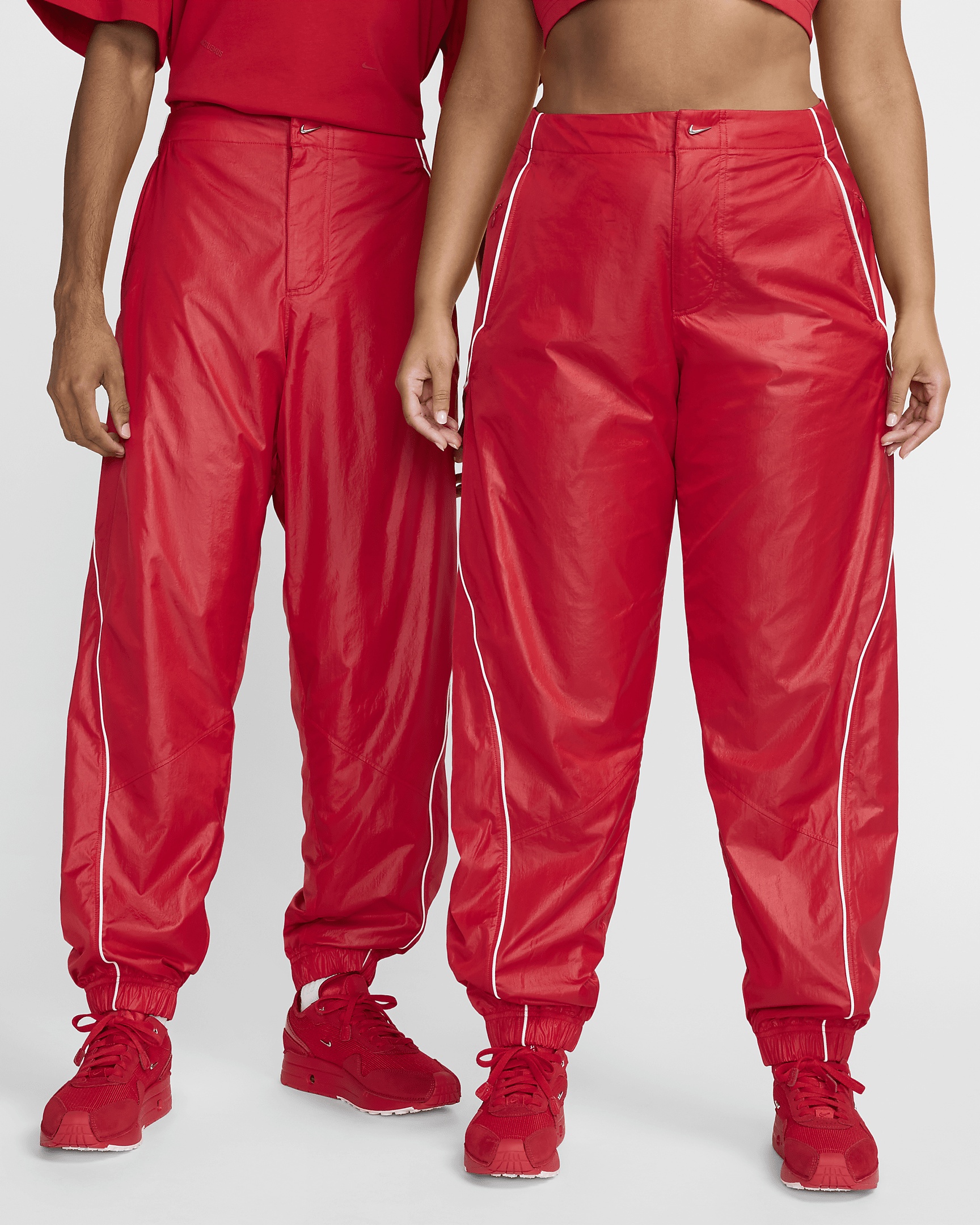 French designer Simon Porte Jacquemus and Nike team up to create and curate another collection. Clean, crisp and classic, these track pants borrow some iconic design lines while bringing their own modern flair. They're fully equipped with water-repellent and wind-resistant crinkled nylon fabric to help you stay dry. The cool mesh lining offers breathability. Designed to feel relaxed through the seat and thighs to provide an easygoing, casual fit. Product Details - Front snap and zip closure with Swoosh logo at center front - Elastic on back of waistband - Encased elastic at pant hem - Body: 100% nylon. Lining: 100% polyester. - Machine wash - Imported - Shown: University Red/White - Style: FV5701-642 SIZE & FIT Female model is wearing size S and is 5'9"175cm Male model is wearing size M and is 6'3"191cm Standard fit: easy and traditional Fl length: hits below ankle