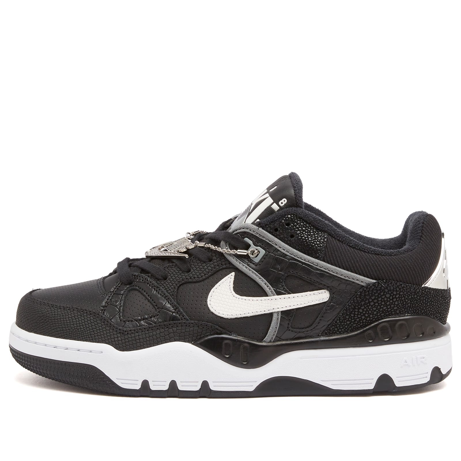 Legendary designer and creative Nigo puts another new spin on the underrated Nike Air Force 3 with this bold “Black Croc” edition. Faux crocodile textures, a metallic silver Nike chain, and split Nigo Force branding bring the streetwear frontman’s edge to this slept-on silhouette. Finished with crisp white accents and a chunky two-tone sole for maximum impact, it’s not one you’ll want to miss. - Textile & Leather Upper - Lace Up Closure - Logo Charms - Nike Air Cushioning - Branded Details - Rubber Outsole - Product Code: HF7630-001