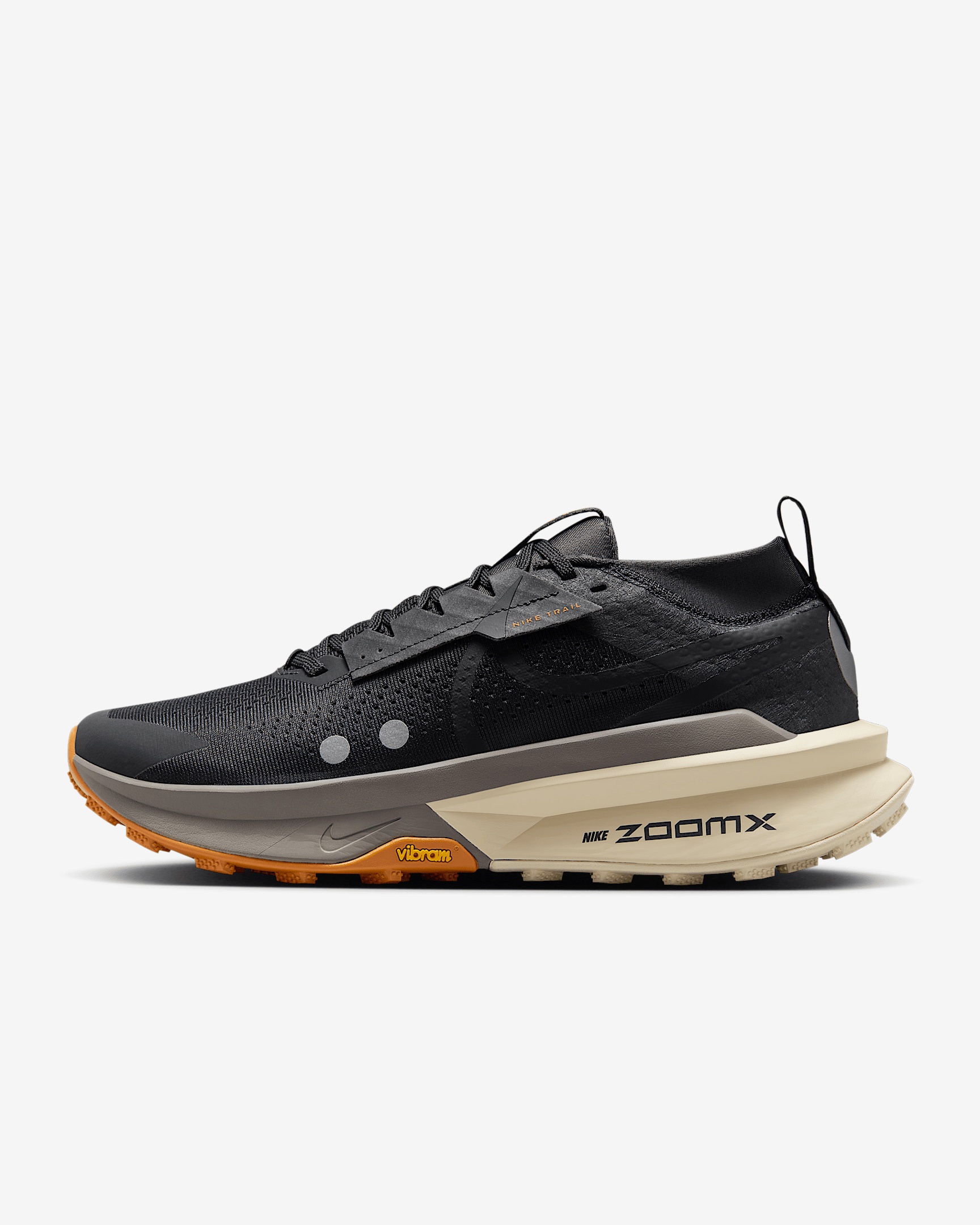 Up the mountain, through the woods, to the top of the trail you can go. Equipped with an ultra-responsive ZoomX foam midsole, the Zegama 2 is designed to conquer steep ridges, jagged rocks and races from trailhead to tip. Optimal cushioning complements a rugged outsole made for your trail running journey. More Benefits - Ankle gaitor helps limit trail debris. - Overlays stretch across the toe for extra durability. Product Details - Weight: Approx. 320 g/11.2 oz (Men's US 10) - Heel-to-toe drop: 4 mm - Reflective details - Not intended for use as Personal Protective Equipment (PPE) - Shown: Off Noir/Monarch/Pale Ivory/Black - Style: FD5190-008