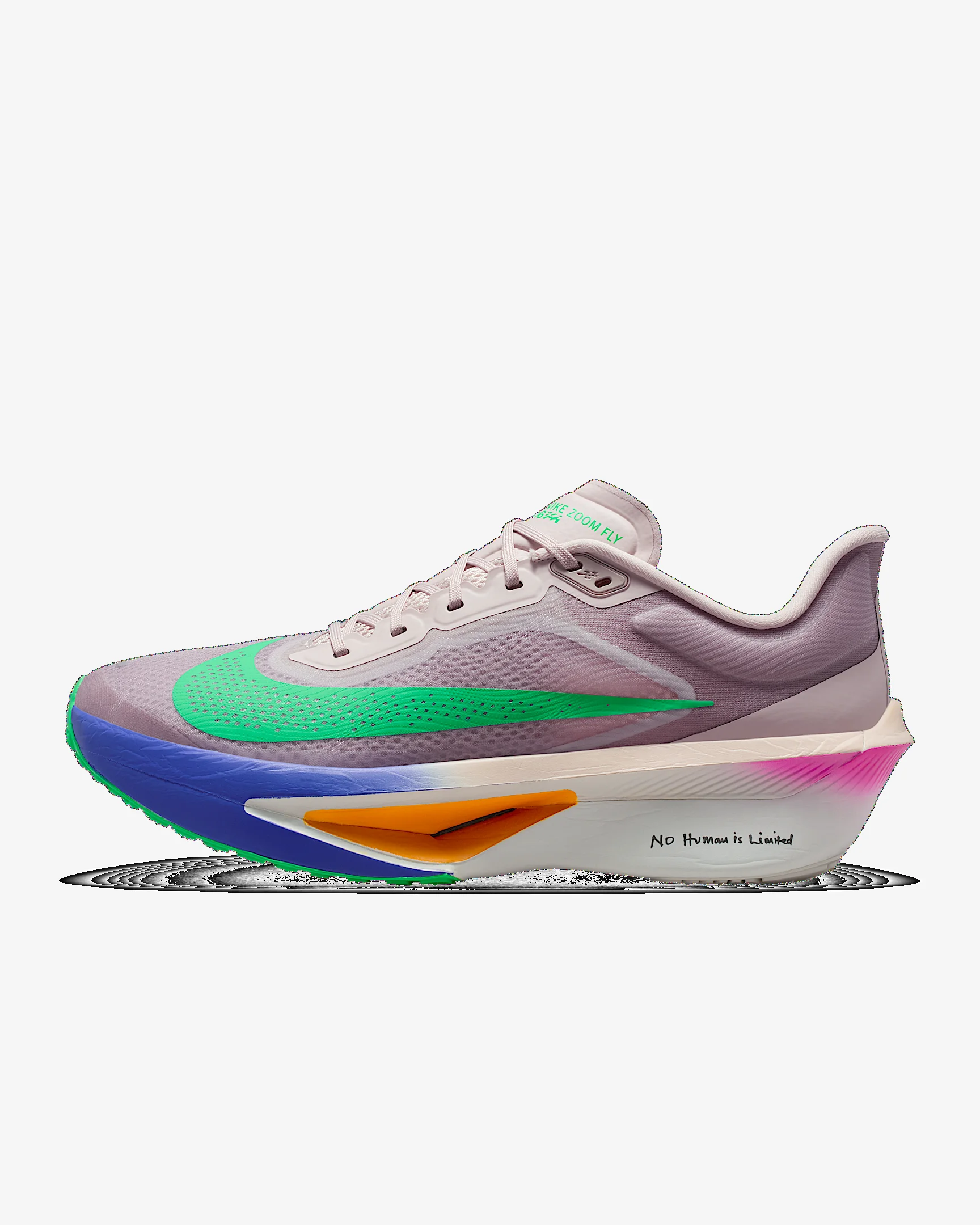 The Zoom Fly 6 is with you every step of your run. Lighter than the Zoom Fly 5, its responsive ZoomX foam adds energy return to each stride, while a carbon fiber plate helps propel you to the finish line. More Benefits - ZoomX foam, Nike’s lightest and most responsive foam, delivers our most energy return with every stride you take. - Full-length carbon fiber plate increases efficiency and responsiveness. - Thin rubber outsole is lightweight and grippy on the road. Product Details - Weight: Approx. 265 g/9.3 oz (Men's US 10) - Heel-to-toe drop: 8 mm - Synthetic leather on upper - Not intended for use as Personal Protective Equipment (PPE) - Shown: Silt Red/Persian Violet/Fire Pink/Green Shock - Style: HJ7038-600
