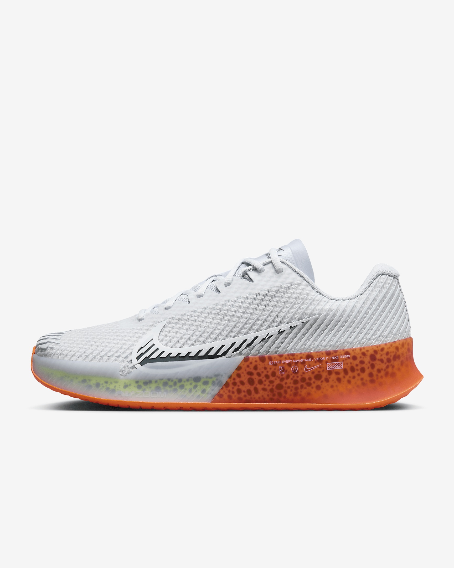 Validated by the greats of the game, the Vapor 11 is back and better than ever. Lower to the court than the previous iteration and loaded with speed components, it helps you play at a fast pace with enough support to help keep you bobbing and weaving for sets on end. Mainstays like the ultra-trusted molded sidewall and breathable upper complement a durable, quick-moving design that you’ve come to know and love. More Benefits - The outsole uses a data-informed design to create optimal grip without impacting your ability to slide. - We removed rubber in low-wear areas to help keep weight at a minimum. - Durable, reinforced mesh helps keep your feet cool and adds extra support. - Full-length foot frame on the outside of the shoe helps stabilize your foot during quick cuts. Product Details - Designed for wear on hard court surfaces - Mesh collar - Shown: Multi-Color/Multi-Color - Style: FV2276-900