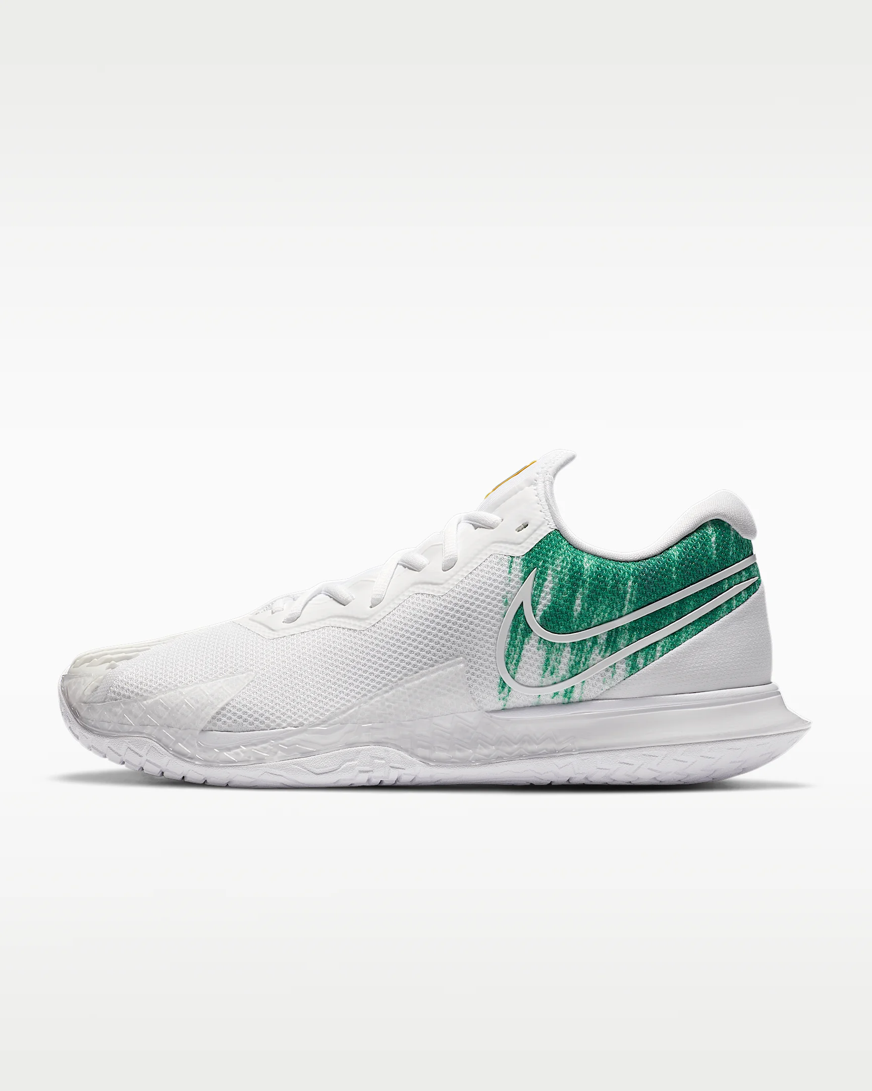 The NikeCourt Air Zoom Vapor Cage 4 is innovated to withstand your toughest matches—thanks to an updated design that puts flexible, durable materials exactly where they're needed the most. A unique lacing system keeps your laces hidden for extra durability while sliding. More Benefits - Stiff frame on the lateral side creates a stable feel during side-to-side movements. - 1/2-length sleeve gives you a sock-like fit. - Designed for use on hard court surfaces. Product Details - Removable insole - Shown: White/Clover/White - Style: CD0424-102