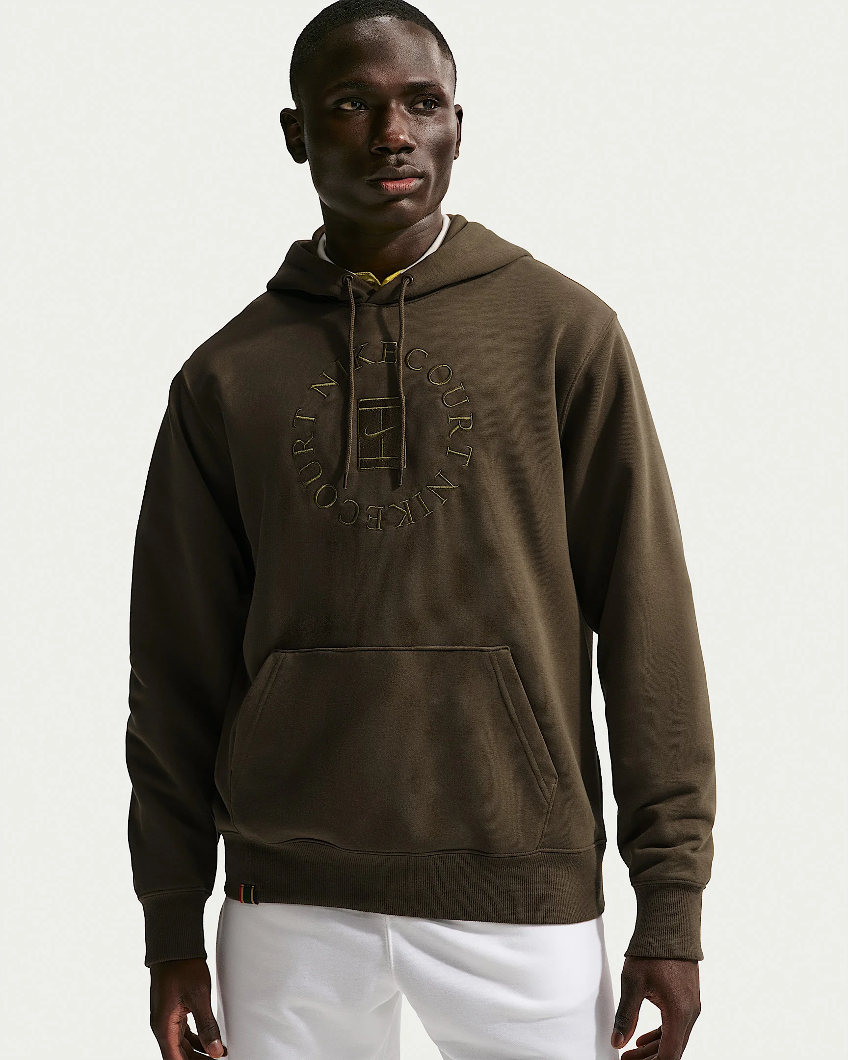 On-court performance tech meets off-court comfort. This soft, sweat-wicking hoodie has a relaxed fit and embroidered NikeCourt graphics that serve up unmistakable tennis heritage. Benefits - Smooth on the outside with unbrushed loops on the inside, this midweight French terry helps create breathability, so it’s comfy enough for you to wear all year long, no matter the temp. - Nike Dri-FIT technology moves sweat away from your skin for quicker evaporation, helping you stay dry and comfortable. Product Details - Thick ribbing at cuffs and hem - Kangaroo pocket - Body: 54% polyester/46% cotton. Rib: 96% cotton/4% spandex. Hood lining: 70% cotton/30% polyester. - Machine wash - Imported - Shown: Dark Hazel/Saffron Quartz - Style: HM6759-212 SIZE & FIT Model is wearing size M and is 6′1″184cm Standard fit: easy and traditional
