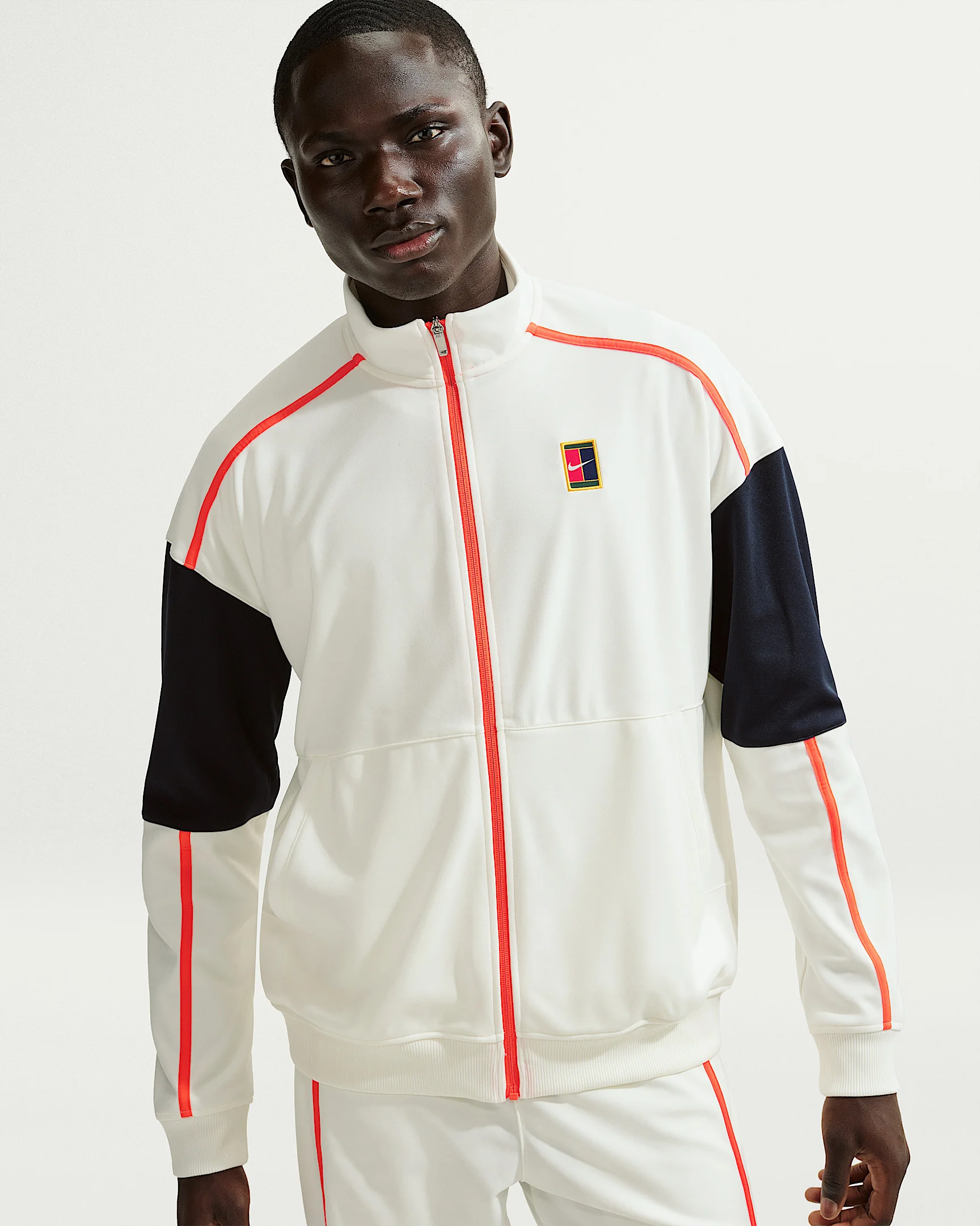 This heritage tennis jacket offers a classic, comfortable look to your pre- and post-match outfit. It features soft, peached fabric, a structured collar and a throwback NikeCourt patch. Benefits - Soft poly-knit fabric has a peached texture on the inside for extra softness. - Soft extended ribbing on the cuffs and hem gives extra fitted comfort. Product Details - Multicolor NikeCourt patch - Full-zip design - Body/Mesh: 100% polyester - Machine wash - Imported - Shown: Sail/Turf Orange - Style: FZ6925-133 SIZE & FIT Model is wearing size M and is 6'1"184cm Loose fit: roomy and relaxed