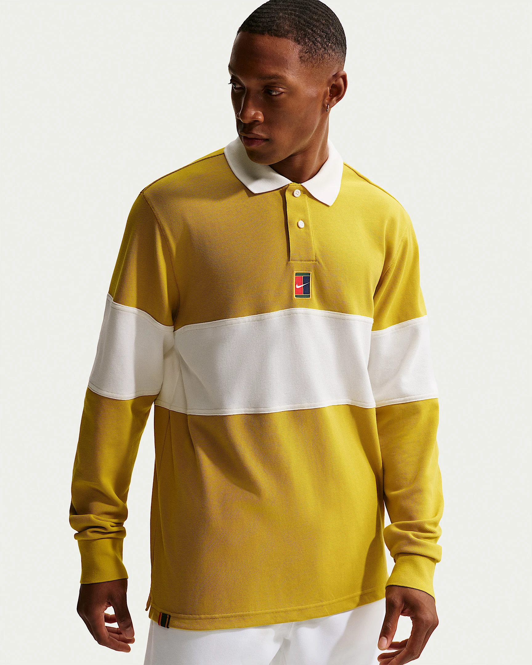 A style you can wear to the court and around town, this top's pique fabric has a subtle texture and weight for a crisp look and soft feel. Product Details - 100% cotton - 2-button placket - Ribbed collar and cuffs - Woven NikeCourt logo patch - Machine wash - Imported - Shown: Saffron Quartz/Sail - Style: HQ1748-389 SIZE & FIT Model is wearing size M and is 5'11"179cm Standard fit: easy and traditional