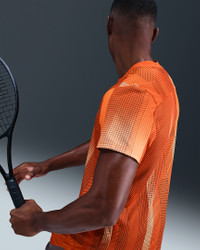 Breathable, stretchy and sweat-wicking, the Victory top is always ready to hit the court. The back shoulder seam placement is designed to stay out of the way while you rotate and drive through the ball. Benefits - Nike Dri-FIT technology moves sweat away from your skin for quicker evaporation, helping you stay dry and comfortable. - Soft and breathable, this smooth knit helps you stay cool and comfortable. - Offset seam construction on the back helps with range of motion through your shot. Product Details - Embroidered Swoosh logo - 100% polyester - Machine wash - Imported - Shown: Campfire Orange/White - Style: HM6505-893 SIZE & FIT Standard fit: easy and traditional