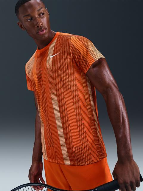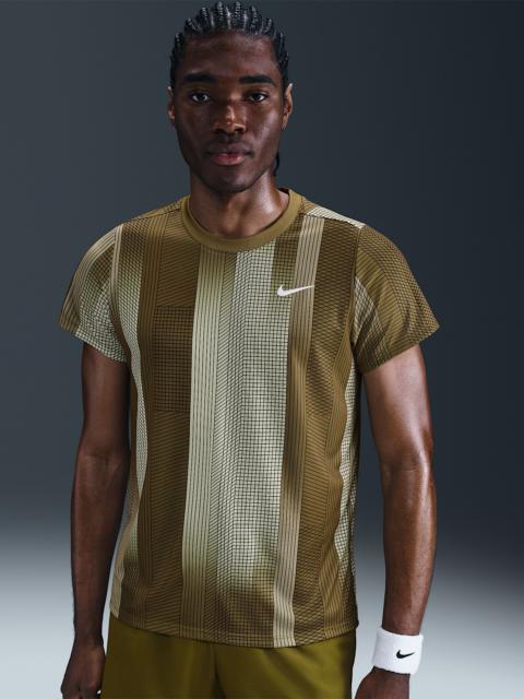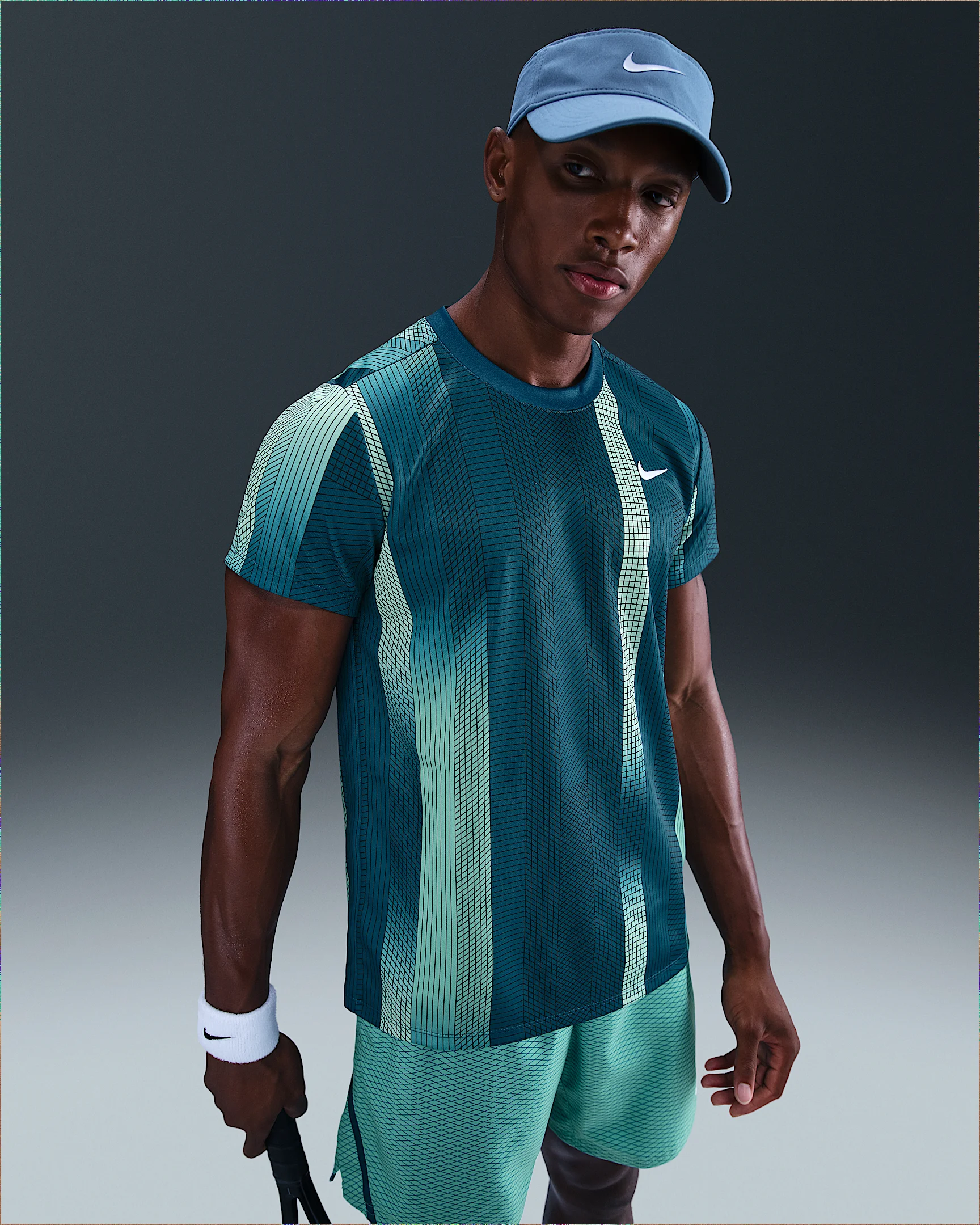 Breathable, stretchy and sweat-wicking, the Victory top is always ready to hit the court. The back shoulder seam placement is designed to stay out of the way while you rotate and drive through the ball. Benefits - Nike Dri-FIT technology moves sweat away from your skin for quicker evaporation, helping you stay dry and comfortable. - Soft and breathable, this smooth knit helps you stay cool and comfortable. - Offset seam construction on the back helps with range of motion through your shot. Product Details - Embroidered Swoosh logo - 100% polyester - Machine wash - Imported - Shown: Blue Force/White - Style: HM6505-415 SIZE & FIT Model is wearing size M and is 5′11″179cm Standard fit: easy and traditional