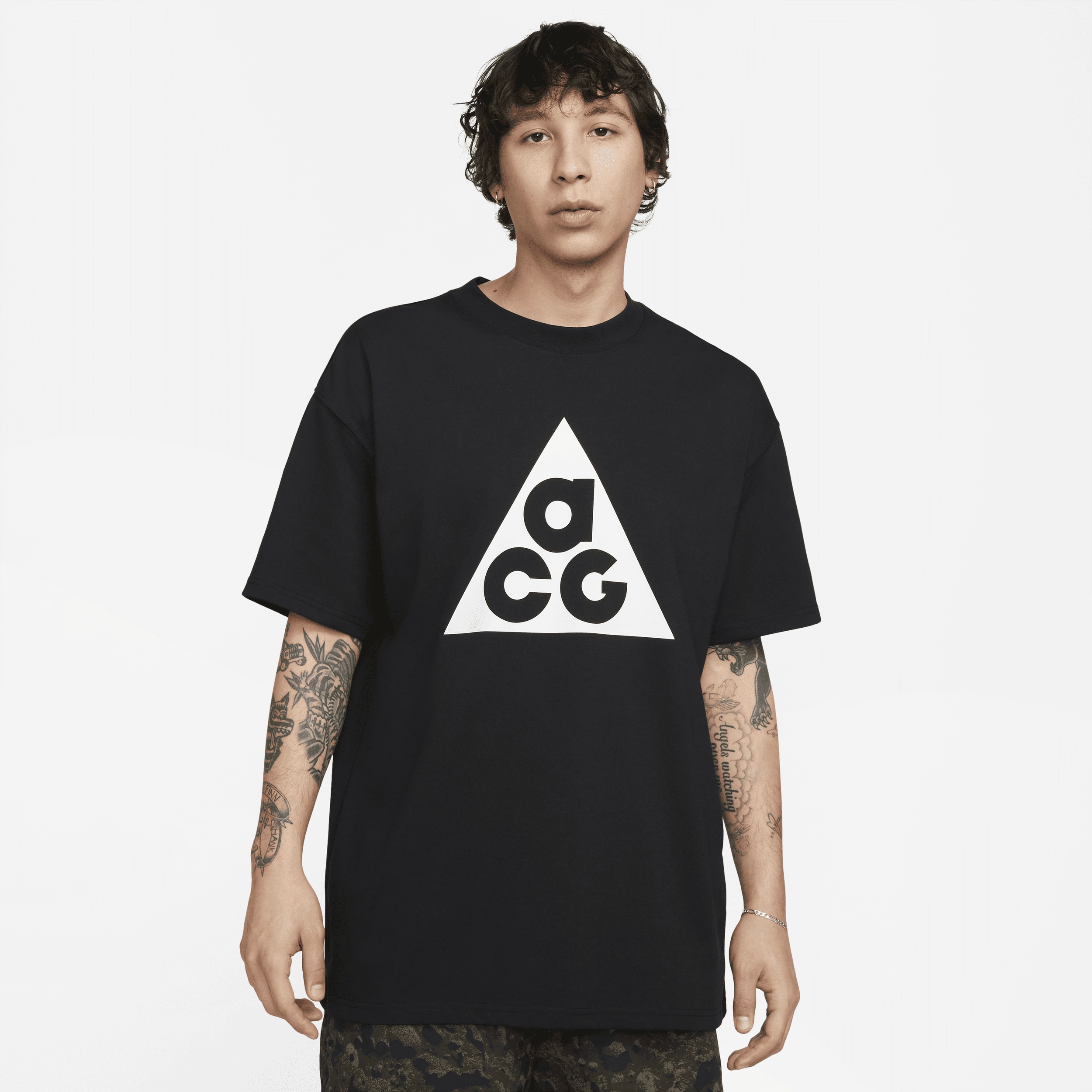 COMFORTABLE TRAILS AHEAD. Loose, roomy, outdoor ready. The Nike ACG T-Shirt keeps things comfy with a graphic repping "All Conditions Gear." This product is made with 100% sustainable materials, using a blend of both recycled polyester and organic cotton fibers. The blend is at least 10% recycled fibers or at least 10% organic cotton fibers. Northwest Tested:This product was designed and tested in Oregon, USA. Less Sweat:Knit fabric with sweat-wicking technology helps you stay comfortable and dry. Product Details:Loose fit for a roomy feel. 63% polyester/37% cotton. Machine wash. Imported. Style: DJ3644; Color: Black; Size: M; Gender: Male; Age Group: Adult | Nike ACG Men's Short-Sleeve T-Shirt in Black, Size: Medium | DJ3644-010