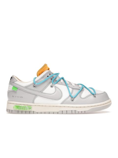 The Nike Dunk Low Off-White Lot 43 combines the classic features of an iconic Nike silhouette and the eclectic details that are the hallmark of designer Virgil Abloh’s fashion brand, Off-White. The Off-White x Nike Dunk Low-Top Lot 43 sports an upper base of white leather with the characteristic perforations in the toebox. The overlays, side panel Nike Swoosh, and heel tab with Nike branding are all crafted out of gray leather. Next come the Virgil Abloh details. Pale, green-tinted lacing zigzags across the upper, and the bright orange tongue with exposed foam has a hole punched through it. Silver Helvetica-font script and a green tag also grace the upper, giving it a distinctive Off-White vibe. What we enjoy most about this shoe Is the sole unit, a combination of classic sneaker dependability with a Virgil Abloh touch. The Sail-colored midsole with vulcanized cupsole construction rests on a gray rubber outsole and features a multicolored "43 of 50" patch. The Nike Dunk Low Off-White Lot 43 was released on August 9, 2021, for a retail price of $180. - Style DM1602-128 - Colorway Sail/Neutral Grey-Barely Volt - Retail Price 180 - Release Date 2021-08-09 - Featured false