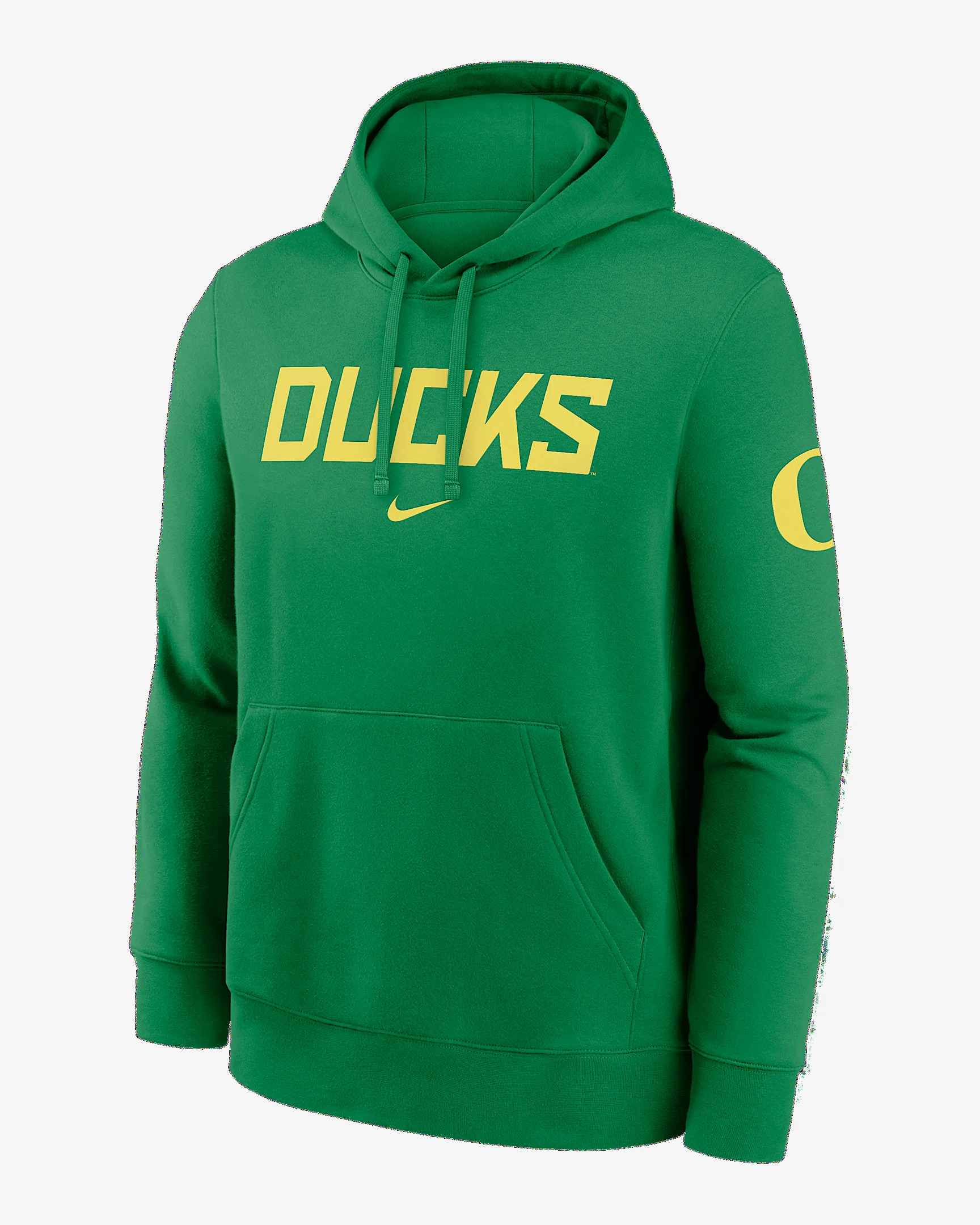 Featuring team details on the front and left sleeve, this Club 2-Hit Nickname Hoodie is made with cozy fleece fabric and a brushed French terry lining to help you comfortably support Oregon in chilly temperatures. Product Details - Front pocket - Hood with drawstring - 82% cotton/18% polyester - Machine wash - Imported - Shown: Apple Green - Style: NKDK30DUON-H5W