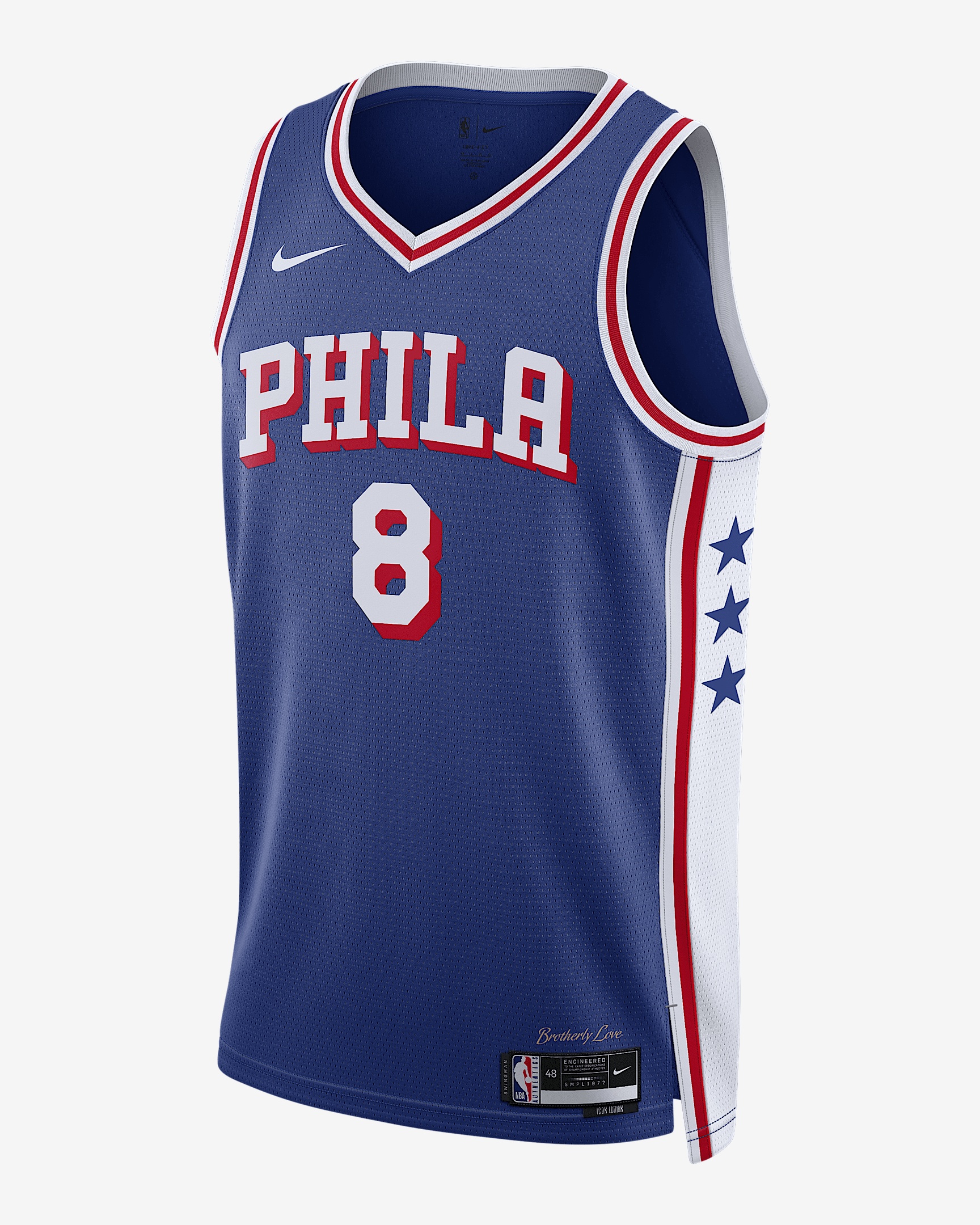 Every team has its true colors, an unmistakable identity that sets it apart from the rest of the league. Honoring a rich hoops heritage, this 76ers jersey is inspired by what the pros wear on the hardwood, from squad details to lightweight, sweat-wicking mesh. It helps keep you dry and cool on or off the court while you rep your favorite player and the game you love. Benefits - Nike Dri-FIT technology moves sweat away from your skin for quicker evaporation, helping you stay dry and comfortable. - Breathable mesh helps keep you cool on or off the court. Product Details - Twill player name and number - Jock tag at hem - Heat-applied graphics - 100% polyester - Machine wash - Imported - Shown: Rush Blue - Style: DX8620-495 SIZE & FIT Standard fit: easy and traditional