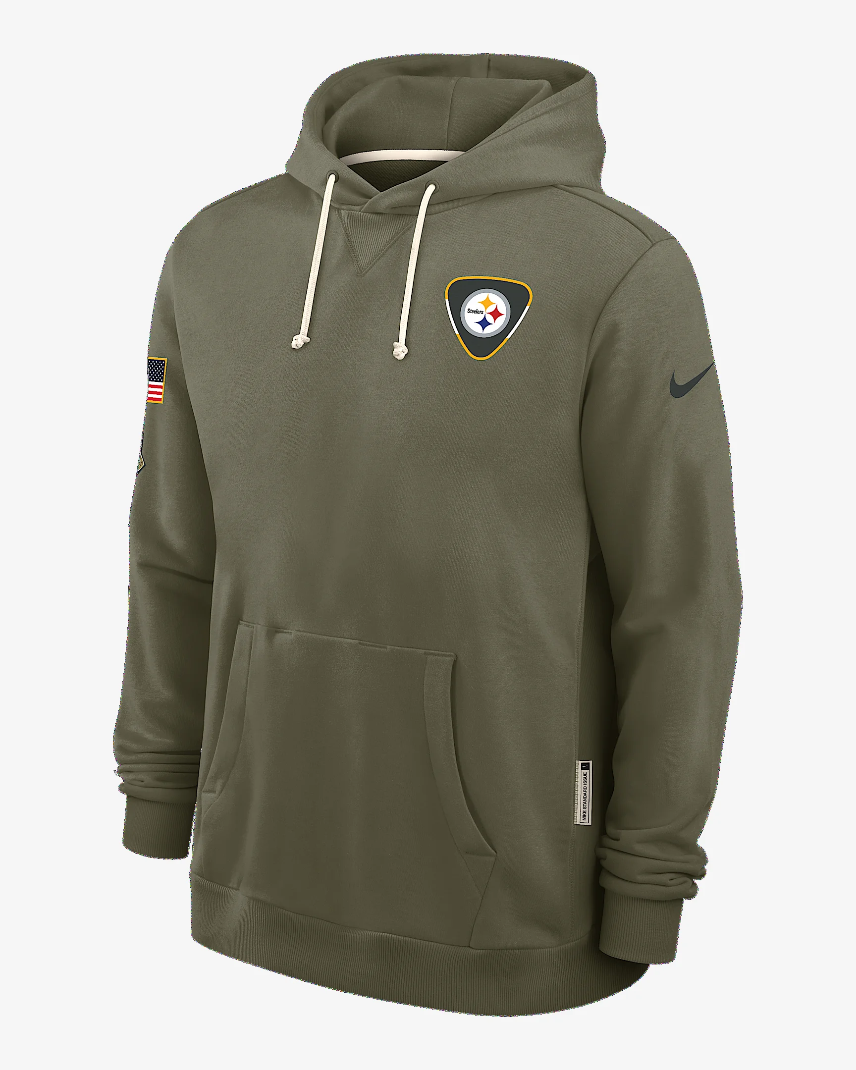 Featuring a military-inspired design, the Salute to Service Sideline Dominant Force Hoodie combines sweat-wicking technology with a soft fleece lining to help you comfortably support the Pittsburgh Steelers and active or retired service members in cooler weather. Benefits - Nike Dri-FIT technology moves sweat away from your skin for quicker evaporation, helping you stay dry and comfortable. - Dolman sleeves help increase range of motion with a roomy fit under the arms. Product Details - Hood with drawstring - Front pocket - Zippered pocket at right side - 53% polyester/47% cotton - Machine wash - Imported - Shown: Olive - Style: 03AZ2DHA2S-D4V