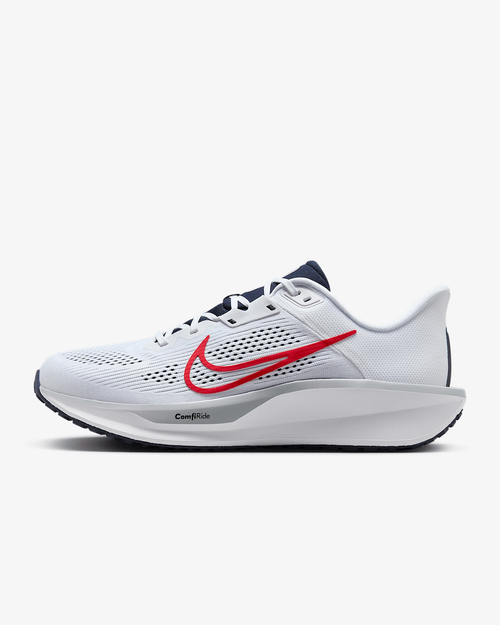 The Nike Quest 6 is for runners of all levels. But make no mistake, it's anything but entry-level. A supercomfortable and supportive midfoot fit band helps keep you stable for your miles. Plus, a supersoft midsole foam helps cushion each step. Benefits - Midfoot fit band helps keep your foot more secure the tighter your laces are. - Increased midsole height means a softer and more responsive ride compared to the Quest 5. - Rubber outsole has the traction to help keep your feet gripped to the pavement. Product Details - Weight: Approx. 295 g/10.4 oz (Men's US 10) - Heel-to-toe drop: 10 mm - Shown: White/Obsidian/Wolf Grey/University Red - Style: FD6033-107