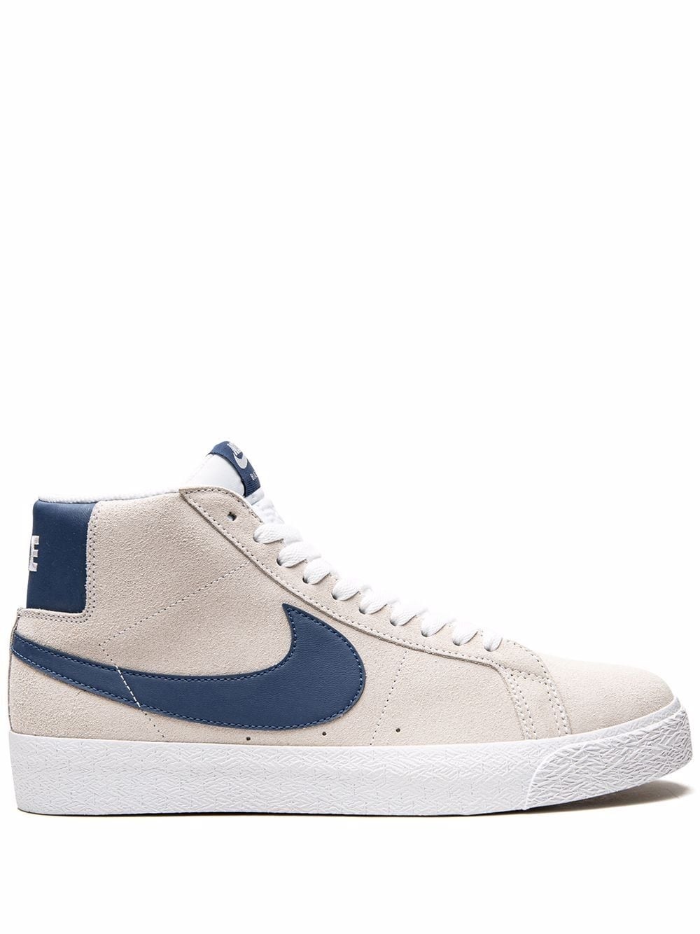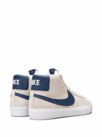 SB Blazer Mid sneakers The Nike SB Blazer Mid sneaker has a style that matches its retro design. They're crafted from suede in a light grey hue and highlighted by a blue Swoosh on the sides and the brand's logo on the tongue. Underneath, a flat rubber sole adds comfort to the design. Imported Composition Outer: Suede 100% Sole: Rubber 100% Lining: Fabric 100%