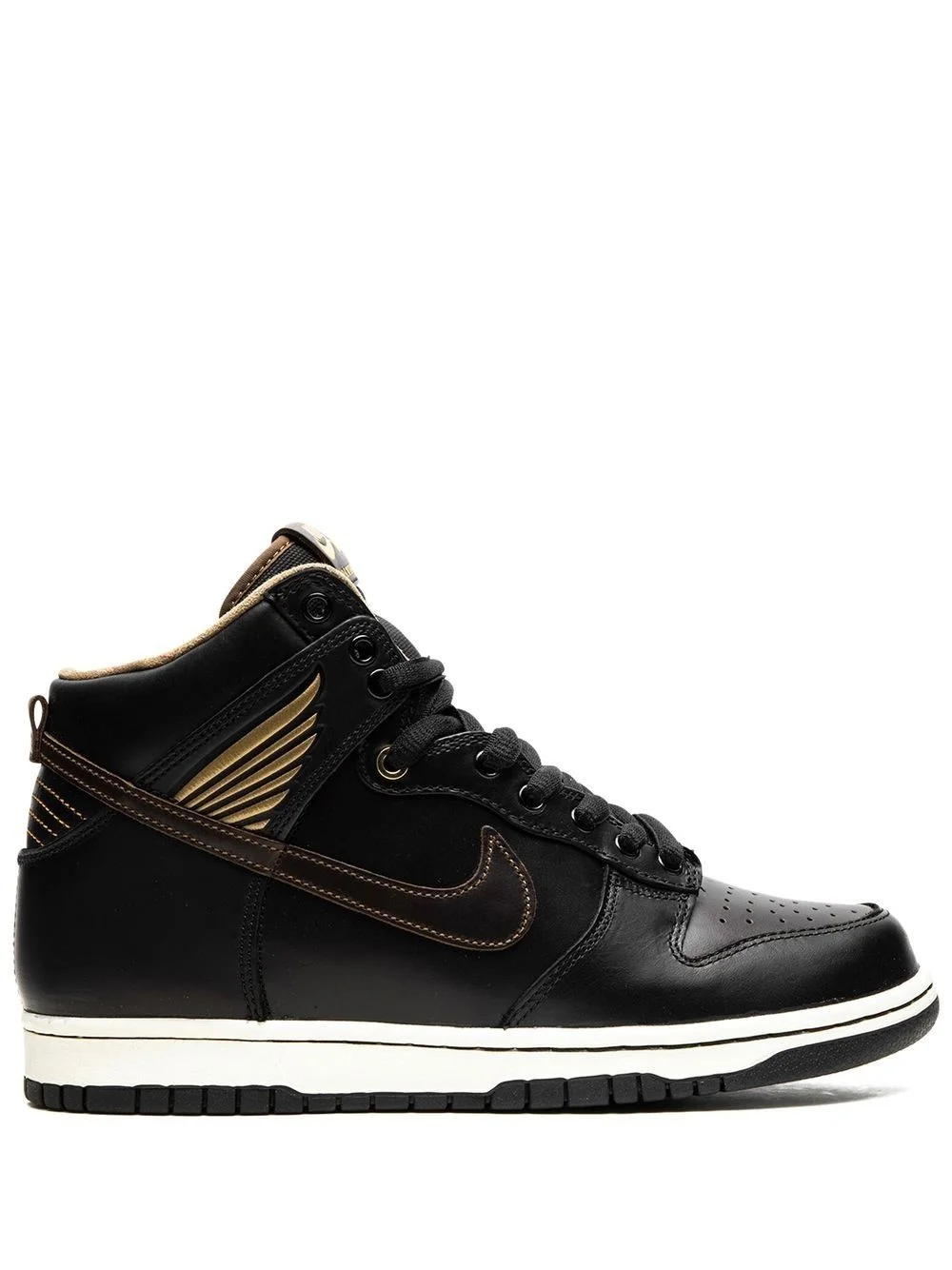 SB Dunk High "Pawnshop" sneakers The Nike x Pawnshop Skate Co. SB Dunk High sneakers feature a sleek all-black design. This model is primed with an ultra-smooth black leather base, matched with subtle rich brown toe boxes and medial Swooshes adorned with golden contrast stitching. A Pawnshop Skate Co.’s 'Wing & Wheel' emblem appears embroidered onto the ankle flaps and stamped on the insoles. Highlights - Black - Leather - Signature swoosh logo detail - Round toe - Front lace-up fastening - Logo patch at the tongue - Ankle-length - Branded insole - Rubber sole - These styles are supplied by a premium sneaker marketplace. stocking only the most sought-after footwear, they source and curate some of the most hard to find sneakers from around the world. Imported Composition Leather 100%