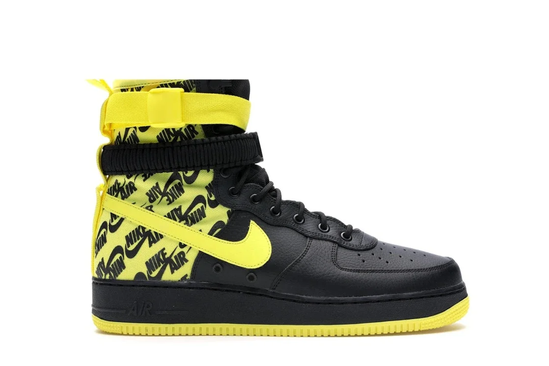 The Nike SF Air Force 1 High Black Dynamic Yellow is an iteration of the Nike SF-AF1 High sneaker in a black and Dynamic Yellow colorway. This Nike SF Air Force 1 sneaker features a black leather upper highlighted by Dynamic Yellow ballistic mesh that stretches up to the collar. More Dynamic Yellow accents appear on the leather Swooshes and ballistic strap on the collar. The ballistic mesh is highlighted by black Nike logos that run throughout the heel. Other details include a black extended synthetic tongue, an additional elastic strap, branding details on the tongue and the collar strap, toebox perforations, and an extended heel pull tab. A black midsole and a Dynamic Yellow rubber outsole finish off the design. Our experts love this sneaker’s construction and colorway. The high-top construction with different materials and detailing gives it a unique design, while the color combination adds a bold and eye-catching look. The Nike SF Air Force 1 High Black Dynamic Yellow was made available on June 1st, 2018, retailing at $180. - Style AR1955-001 - Colorway Black/Dynamic Yellow - Retail Price 180 - Release Date 2018-06-01 - Featured false - Product Line Nike Air Force