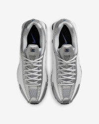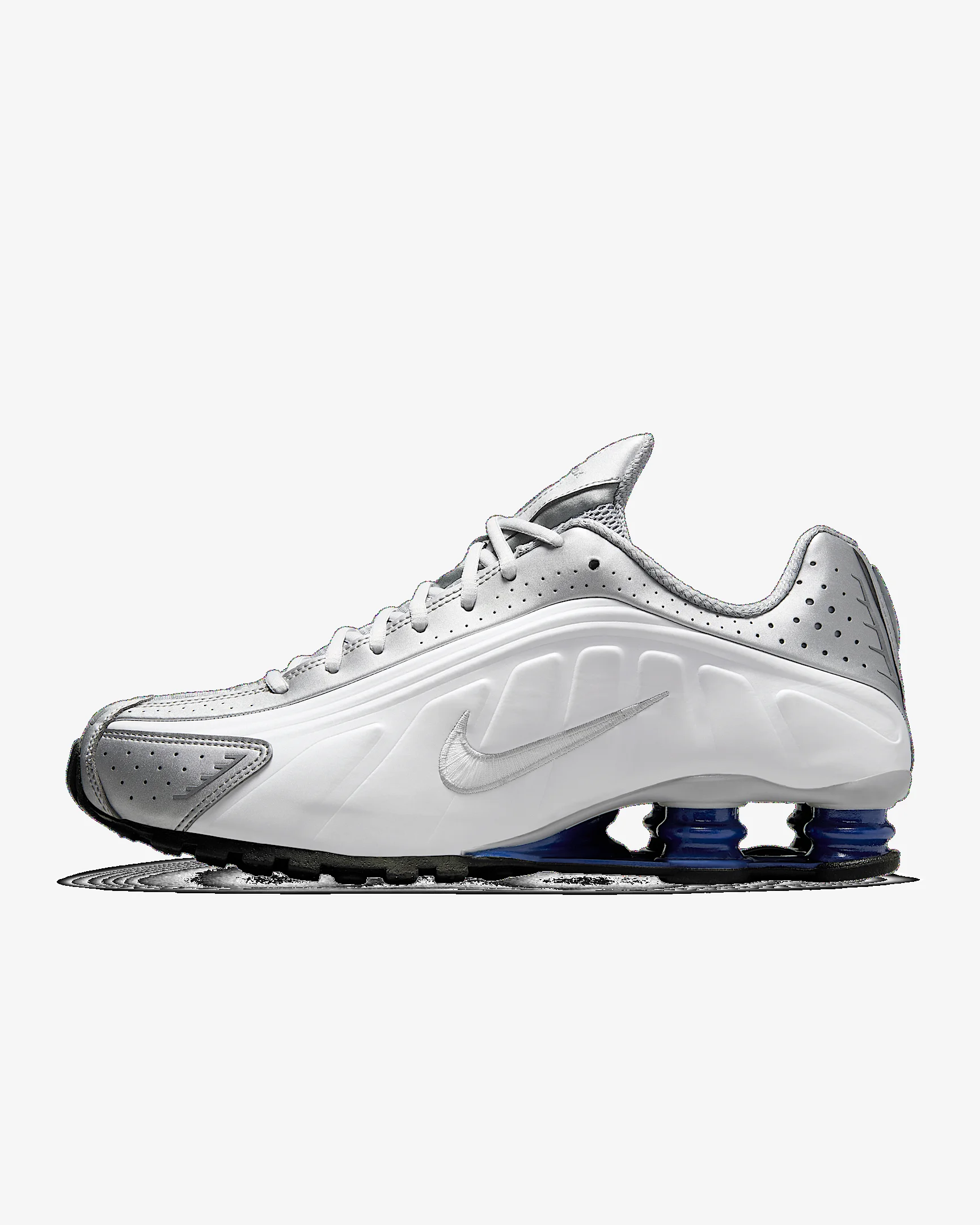 A recrafted version of the early 2000s icon, the Nike Shox R4 replicates the original with its futuristic design lines and performance-like cushioning. Nike Shox columns in the heel distribute weight to maximize comfort while providing a bold look on the streets. Benefits - Synthetic and textile upper is soft and durable. - Nike Shox technology features resilient, flexible columns that compress and regain shape for outstanding cushioning. - Modified, circular Waffle outsole offers great traction. - Laser perforations throughout provide ventilation. Product Details - Foam midsole - Rubber outsole - Not intended for use as Personal Protective Equipment (PPE) - Shown: White/Metallic Silver/Deep Royal Blue/White - Style: HQ1988-102