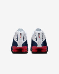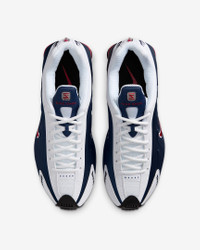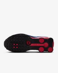 A recrafted version of the early 2000s icon, the Nike Shox R4 replicates the original with its futuristic design lines and performance-like cushioning. Nike Shox columns in the heel distribute weight to maximize comfort while providing a bold look on the streets. Benefits - Synthetic and textile upper is soft and durable. - Nike Shox technology features resilient, flexible columns that compress and regain shape for outstanding cushioning. - Modified, circular Waffle outsole offers great traction. - Laser perforations throughout provide ventilation. Product Details - Foam midsole - Rubber outsole - Not intended for use as Personal Protective Equipment (PPE) - Shown: Midnight Navy/White/Metallic Silver/Gym Red - Style: HQ1988-400