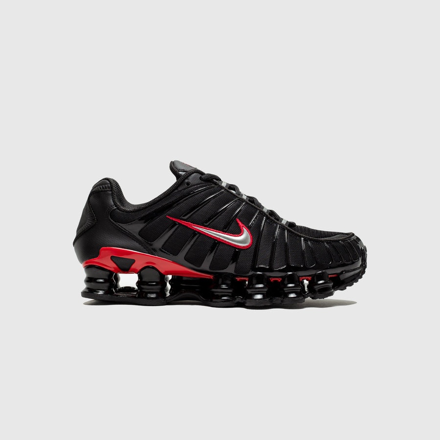 - CN0151 003 - Black/Metallic Silver-University Red - Nike revives the distinctive Shox TL silhouette from the early 2000's with a modern twist - Black mesh upper - Black synthetic overlays - Metallic silver embroidered swoosh on the lateral and medial side - Black mesh tongue with TPU emblem and "NIKE SHOX" branding - TPU emblem on the back heel with University red accents - Lace closure - Black shox midsole - Black rubber outsole