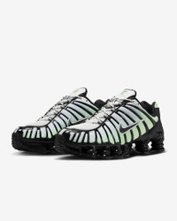 The Nike Shox TL takes mechanical cushioning to the next level. A recrafted version of the 2003 icon, it features breathable mesh in the upper and full-length Nike Shox technology for optimal impact absorption and a bold look on the streets. Benefits - Nike Shox technology combines resilient, flexible columns with moderator plates for outstanding cushioning that compresses and regains its shape. - A combination upper with a full TPU cage is a near-exact replica of the 2003 Nike Shox TL. - Molded overlays throughout the midfoot provide support and a snug fit. - A TPU plate in the heel between the midsole and Nike Shox technology helps provide lateral stability and support. - A foam midsole provides lightweight cushioning. - Non-marking, solid rubber in a modified waffle outsole gives great traction and durability. Product Details - Synthetic and textile upper - Not intended for use as Personal Protective Equipment (PPE) - Shown: Vapor Green/Photon Dust/Black - Style: AV3595-300