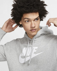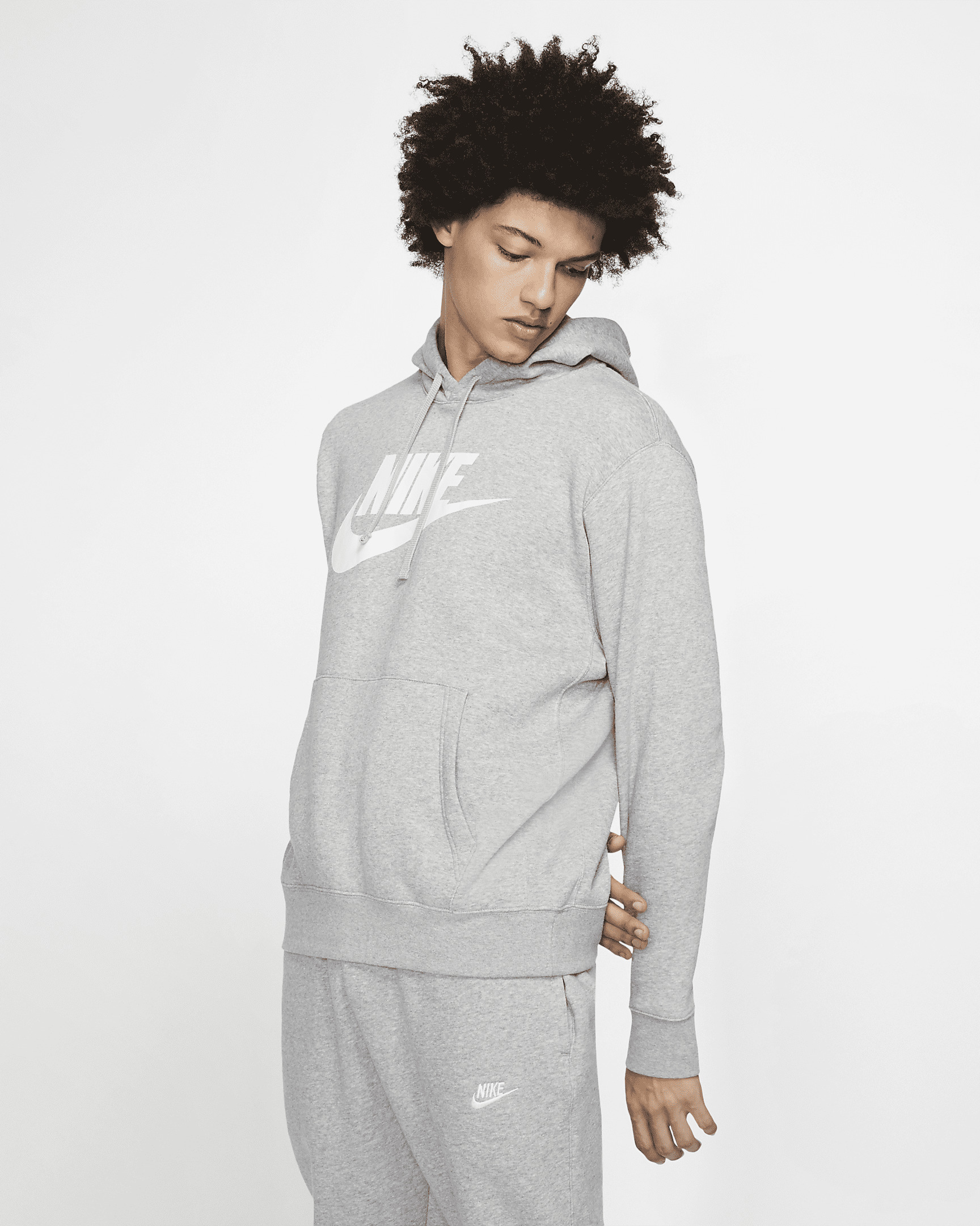 A closet staple, the Nike Sportswear Club Fleece Pullover Hoodie gives you soft comfort in a street-ready style for an elevated, everyday look that you really can wear every day. Benefits - Hood with drawstring offers adjustable coverage. - Fabric is lightly brushed on the back to make it ultra soft and comfortable. - Kangaroo pocket offers convenient storage. Product Details - Ribbing at the hem and cuffs - Fabric: Body: 80% cotton/20% polyester. Hood lining: 100% cotton. - Machine wash - Imported - Shown: Dark Grey Heather/Matte Silver/White - Style: BV2973-063 SIZE & FIT Standard fit: easy and traditional