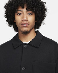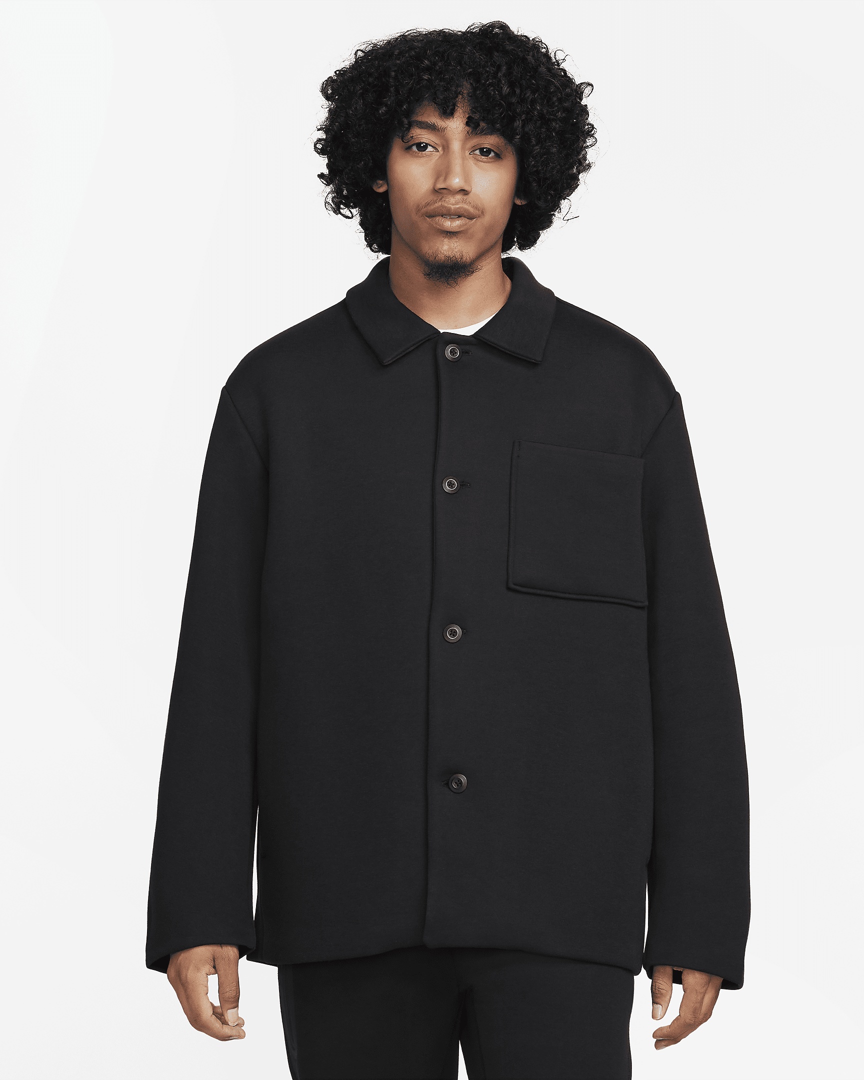 Nike Tech Fleece Reimagined brings fleece into a new era with runway-inspired looks designed to make a statement. This spacious, button-down shacket offers clean, modern lines in a retro-inspired look. Our premium, smooth-on-both-sides fleece feels warmer and softer than ever, while keeping the same lightweight build you love. Wear it with the Tech Fleece Reimagined Open-Hem Pants for a uniform look that lets you escape into comfort. More Benefits - Front button closure lets you adjust your style and coverage. - Side pockets and a drop-in front chest pocket make it simple to store your phone, keys and wallet for hands-free comfort. Product Details - Knockout Swoosh logo on back yoke - Locker loop - Body: 62% polyester/38% cotton. Side Pocket Knuckle Side: 100% cotton. Panels Lining: 66% cotton/34% polyester. - Machine wash - Imported - Shown: Black/Black - Style: FB8167-010 SIZE & FIT Model is wearing size M and is 6′1″185cm Oversized fit: exaggerated and spacious Fits large; we recommend ordering a size down
