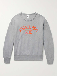 Nike's sweatshirt channels a retro feel, thanks to the wide neckline and arched 'Athletic Dept.' logo flocked across the chest. It's cut from soft, washed cotton-jersey and has dropped shoulder seams for a relaxed fit. Size & Fit - Fits true to size. Take your normal size - Designed for a relaxed fit - Mid-weight, stretchy fabric - Model is shown wearing a M - Model measures: chest 38"/ 96cm, height 6'2"/ 188cm Details & Care - Grey mélange fleece-back cotton-jersey - 100% cotton - Machine wash - Designer colour: Carbon Heather/ Team Orange - This item has been imported