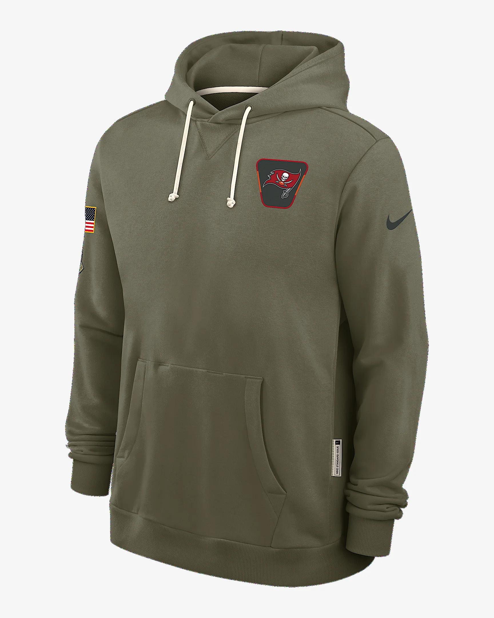 Featuring a military-inspired design, the Salute to Service Sideline Dominant Force Hoodie combines sweat-wicking technology with a soft fleece lining to help you comfortably support the Tampa Bay Buccaneers and active or retired service members in cooler weather. Benefits - Nike Dri-FIT technology moves sweat away from your skin for quicker evaporation, helping you stay dry and comfortable. - Dolman sleeves help increase range of motion with a roomy fit under the arms. Product Details - Hood with drawstring - Front pocket - Zippered pocket at right side - 53% polyester/47% cotton - Machine wash - Imported - Shown: Olive - Style: 03AZ2DHA2V-D4V