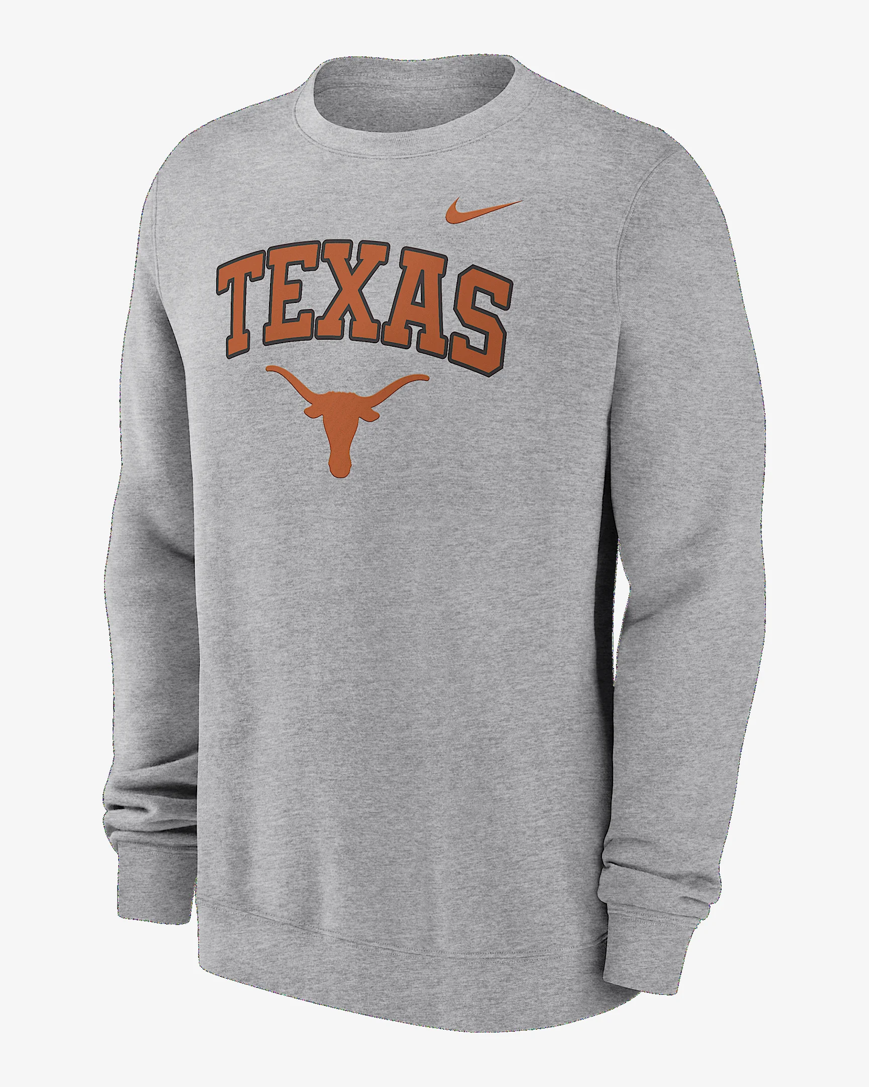 Featuring bold team graphics, the Arch Crew is made with cozy fleece fabric and a brushed French terry lining to help you comfortably support Texas in chilly temperatures. Product Details - 72% cotton/18% polyester/10% organic cotton - Machine wash - Imported - Shown: Grey - Style: NKPU06GTXE-Y48