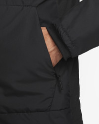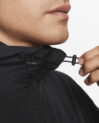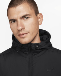 Built for running, training and yoga, our Unlimited collection helps keep you moving throughout the year, thanks to its premium materials and innovative features. For this Therma-FIT jacket, a mid-weight woven fabric is paired with stretchy knit in the side panel and insulation to help your body stay warm. The shell also repels water so you can stay active in wet conditions. Benefits - Hood with toggled drawcords lets you cinch up for the perfect fit. - Front pockets give easy-to-reach storage. - Nike Therma-FIT with Repel sheds rain and helps keep your body warm. - Full-zip design makes for easy changing. - Smooth woven fabric with synthetic insulation helps you stay warm. - Elastic loop lets you easily hang the jacket up. Product Details - Elastic cuffs - Body: 100% polyester. Lining: 100% nylon. Fill: 100% polyester. - Machine wash - Imported - Not intended for use as Personal Protective Equipment (PPE) - Shown: Black/Black - Style: FB7544-010 SIZE & FIT Model is wearing size M and is 6′1″185cm Standard fit: easy and traditional