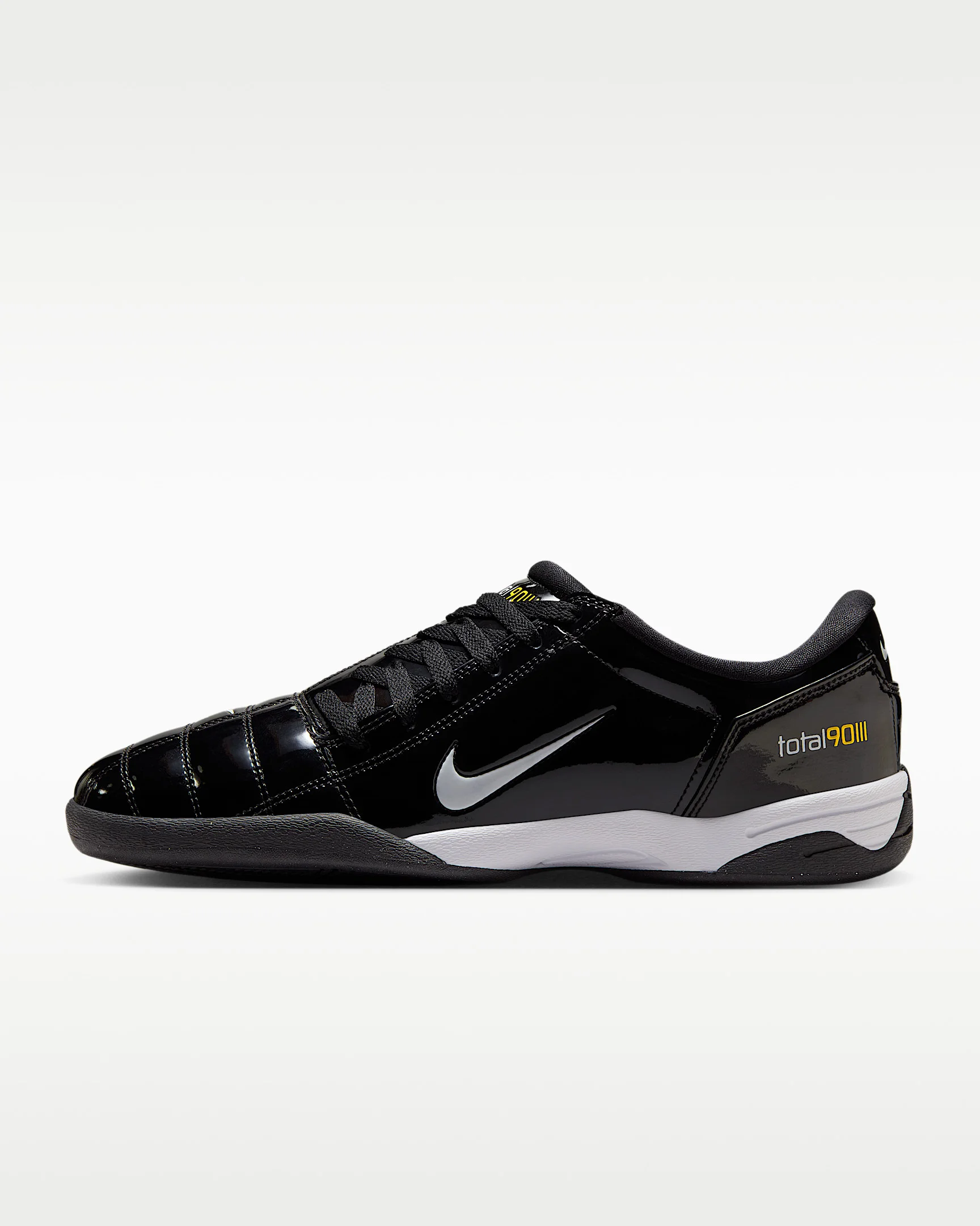 Built on laser precision and a future forward design, the Total 90 reimagines the soccer cleat from the pitch to the streets—for those who dare to break the rules. Benefits - Bold leather and asymmetrical lacing defy norms, creating an elevated look with attitude. - Plush padded collar provides a secure fit without compromising style. - Rubber outsole gives you grip and traction. Product Details - Shown: Black/Metallic Silver/White - Style: HJ9351-001