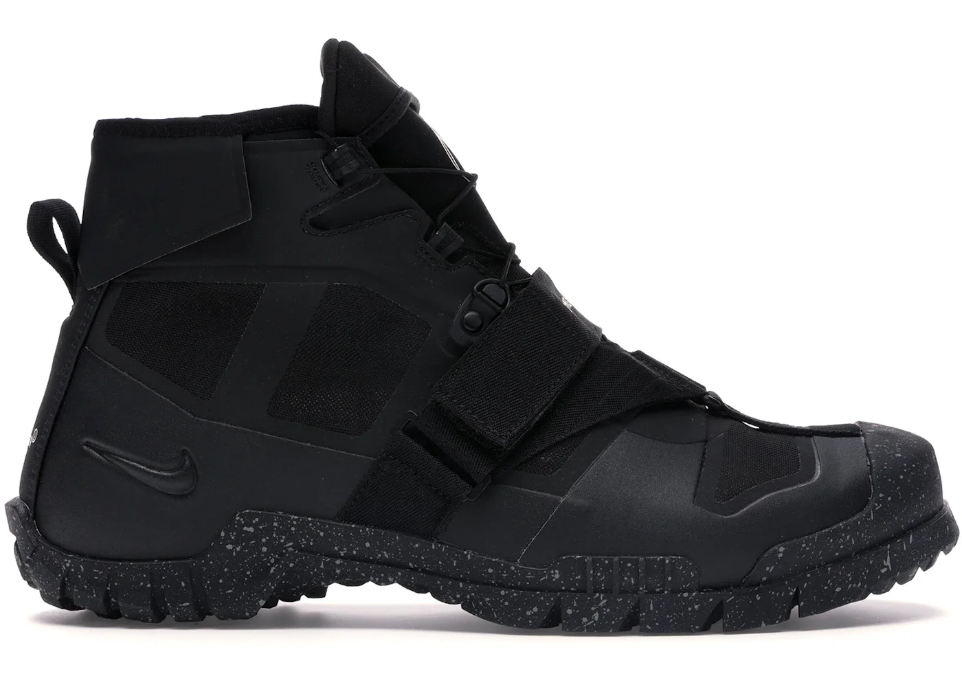 The Nike SFB Mountain Undercover Black’s outsole showcases a rugged tread pattern, offering traction on various surfaces. This is in line with the sneaker’s utilitarian and outdoor-inspired design, making it suitable for urban environments and outdoor adventures alike. The upper of the Nike SFB Mountain Undercover Black is constructed with a combination of different materials. This mesh upper contributes to breathability and adds to the shoe’s lightweight feel. A bungee cord system is integrated into the design, allowing for quick and easy adjustments to the fit while maintaining a secure feel. The midsole of the sneaker boasts a speckled pattern and a rugged sole. One of the defining visual aspects of the Nike SFB Mountain Undercover Black that our experts admire is the crisscrossed webbing, printed with the phrase ‘The New Warriors’. The shoe was first released on April 15, 2019, with a market price of $350. - Style BV4580-001 - Colorway Black/Black - Retail Price 350 - Release Date 2019-04-14 - Featured false