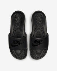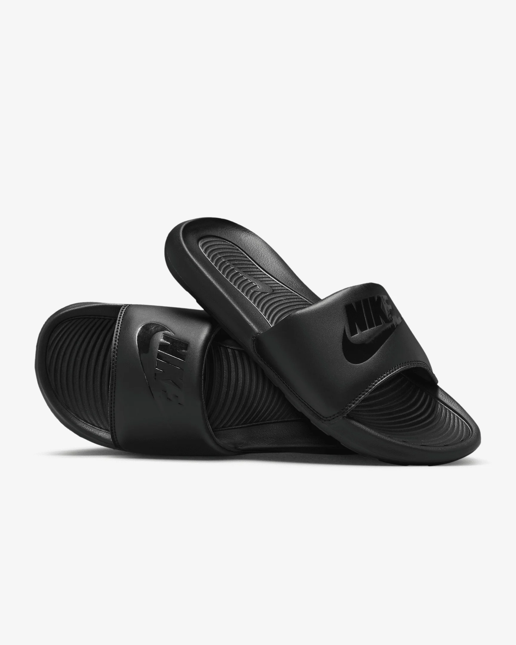 From the beach to the bleachers, the Victori One is a must-have slide for everyday activities. Subtle yet substantial updates like a wider strap and softer foam make lounging easy. Go ahead—enjoy endless comfort for your feet. Benefits - Soft foam adds responsiveness and cushioning. - Textured pattern on the contoured footbed adds grip to help your feet stay in place. - Rolled edges on the padded strap creates a smooth, comfortable feel. - Wider strap provides additional space to help accommodate more sizes. - Outsole pattern is designed for multi-surface traction. Product Details - Shown: Black/Black/Black - Style: CN9675-003
