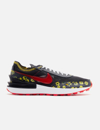 - Nike - Nike Waffle One - Semi-transparent synthetic upper - Leather accents with sunflower graphic prints - Lace-up closure - TPU heel clip - Contrasting Habanero red Waffle rubber outsole - Color: Black/Habanero Red/Vivid Sulfur/White - Style Code: DQ7637-001 - Material: Synthetic, Leather, Rubber - See more Sneakers and Shoes