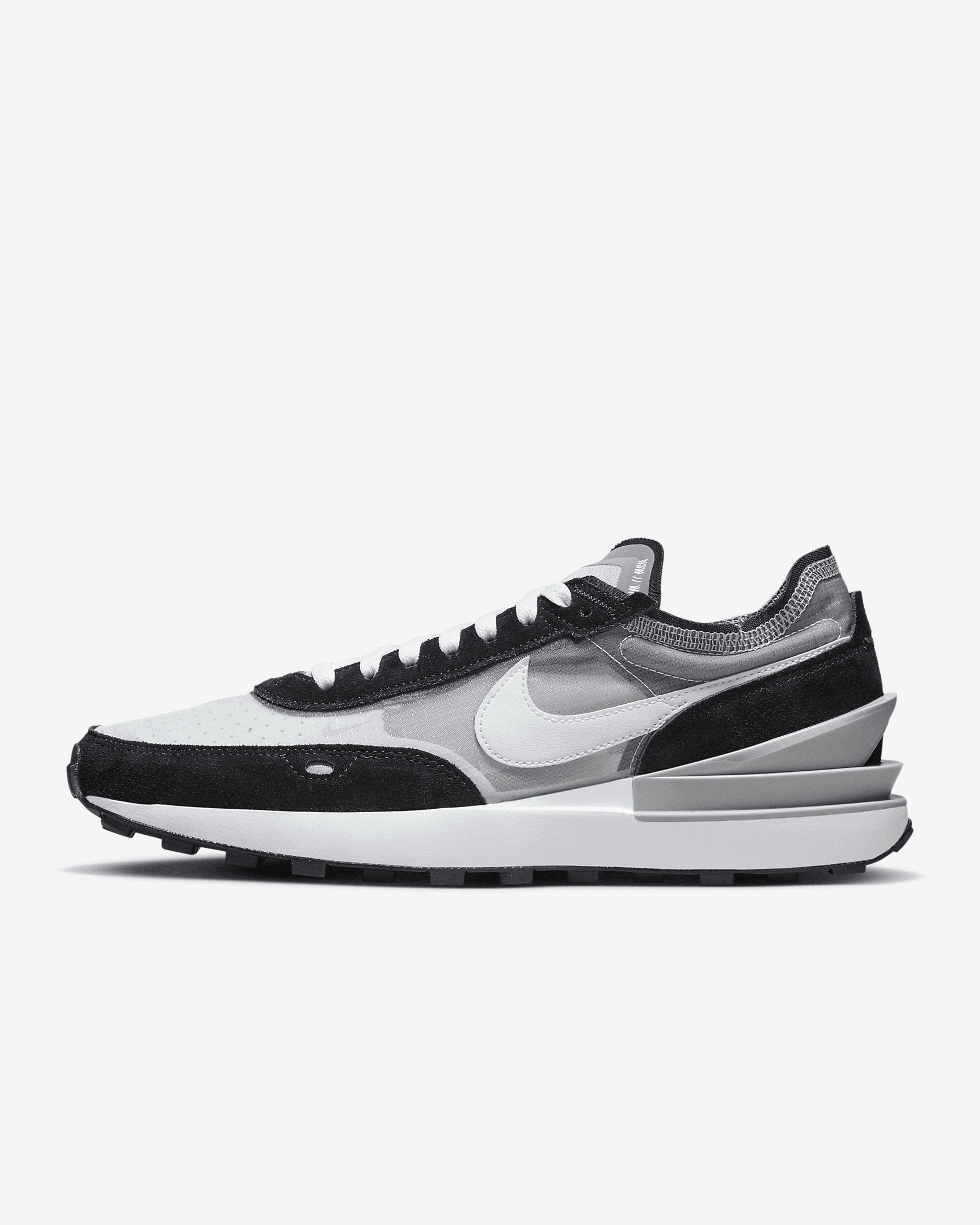 Bringing a new look to the Waffle sneaker family, the Nike Waffle One balances everything you love about heritage Nike running with fresh innovations. Its TPU heel clip adds energy while a mixture of transparent mesh (let that sock game shine) and retro suedes give texture and depth. The updated Waffle outsole provides a level of support and traction you have to feel to believe. Benefits - Mixed upper features transparent mesh and soft suedes, adding dimension and texture to the shoe. - Dual stacked midsole keeps the classic wedge shape of the Waffle franchise for a soft, cushioned ride. - New TPU heel clip creates a dynamic look that adds support and energy while the stitching mixes DIY appeal with urban edginess. - Iconic rubber Waffle outsole has been updated with new molded lugs for added support, traction and durability. - The low-cut collar features soft edges for a sleek look that feels comfortable. Product Details - Rubber sole - Not intended for use as Personal Protective Equipment (PPE) - Shown: Grey Fog/Light Smoke Grey/Photon Dust/Particle Grey - Style: DD8014-004