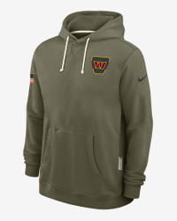 Featuring a military-inspired design, the Salute to Service Sideline Dominant Force Hoodie combines sweat-wicking technology with a soft fleece lining to help you comfortably support the Washington Commanders and active or retired service members in cooler weather. Benefits - Nike Dri-FIT technology moves sweat away from your skin for quicker evaporation, helping you stay dry and comfortable. - Dolman sleeves help increase range of motion with a roomy fit under the arms. Product Details - Hood with drawstring - Front pocket - Zippered pocket at right side - 53% polyester/47% cotton - Machine wash - Imported - Shown: Olive - Style: 03AZ2DHA2Z-D4V