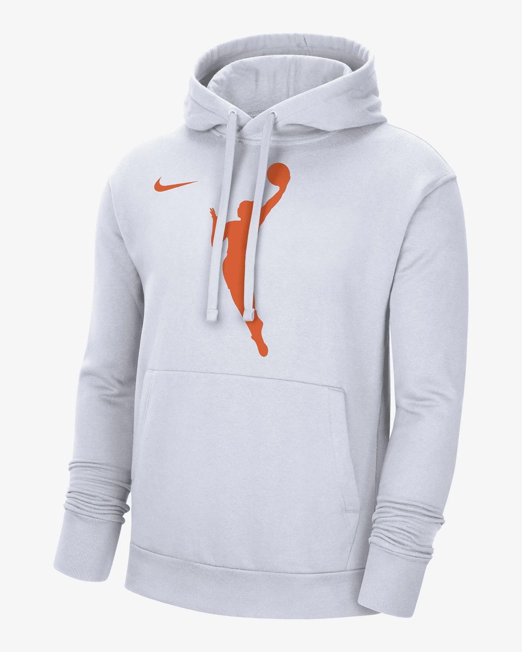 Celebrate 25 years of the WNBA in the warm comfort of this soft fleece hoodie. An iconic silhouette graphic soars front and center to honor the league. Benefits - Smooth on the outside and cozy on the inside, brushed fleece is our go-to sweatshirt material for colder temperatures. - Ribbed cuffs and hem help keep the hoodie in place while you move. Product Details - Loose fit for a roomy feel - Ribbed cuffs and hem - Front pocket - Body: 80% cotton/20% polyester. Hood lining: 100% cotton. - Machine wash - Imported - Shown: White/Brilliant Orange - Style: DR9596-100 SIZE & FIT Standard fit: easy and traditional