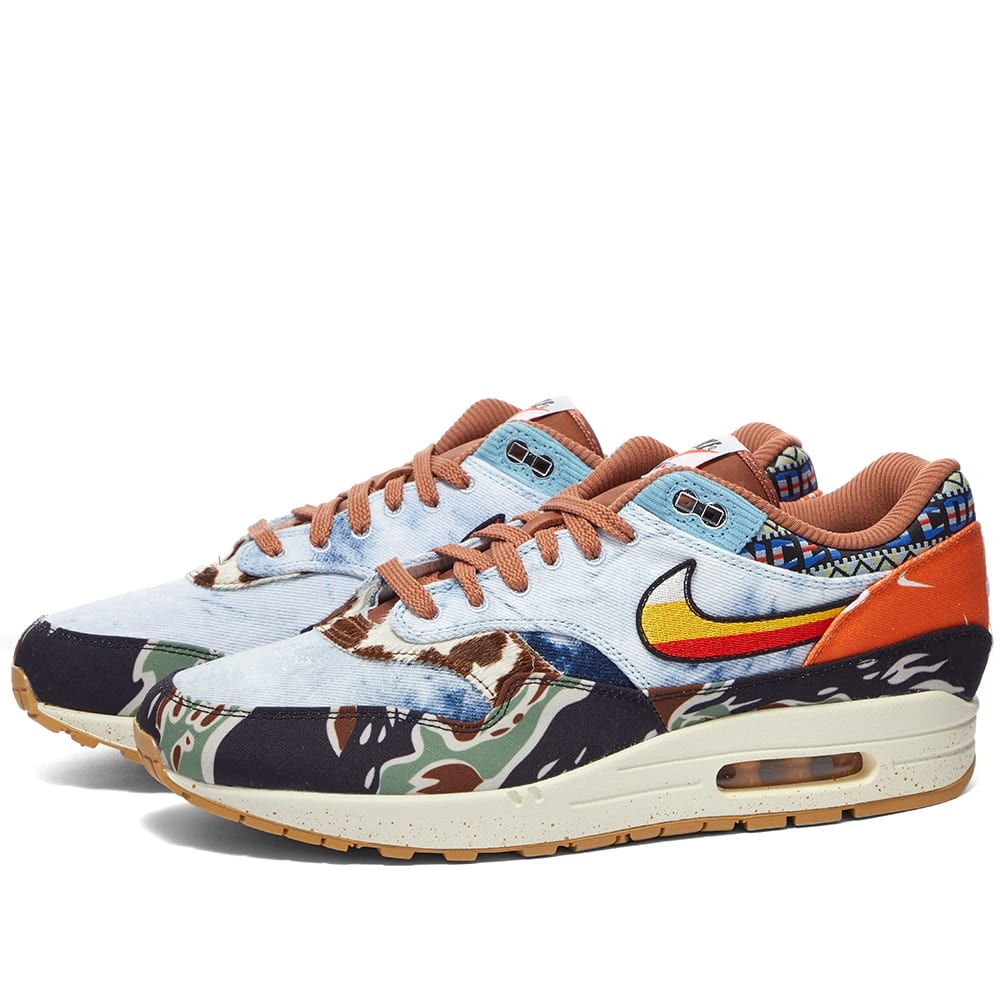 Nike teams up with long-time partner Concepts to celebrate the 35th anniversary of the beloved Air Max 1. Dubbed ‘Message to The Universe’, this collaboration embodies the eccentric, free-spirted displayed by festival goers in the 60’s and 70’s. The uppers are built from light-wash denim, then overlaid with tiger camo print at the mud guard and a vibrant orange bandana graphic at the heel. At the collar, you’ll find the Boston-based boutiques branding and paisley print, while a multi-coloured Swoosh sits proudly on the side wall. In contrast to the eye-catching uppers, however, the sole unit is kept relatively simple, with a speckled midsole and sportswear brand’s iconic Air cushioning. - Textile Uppers - Rubber Outsole - Style Code: DN1803-900