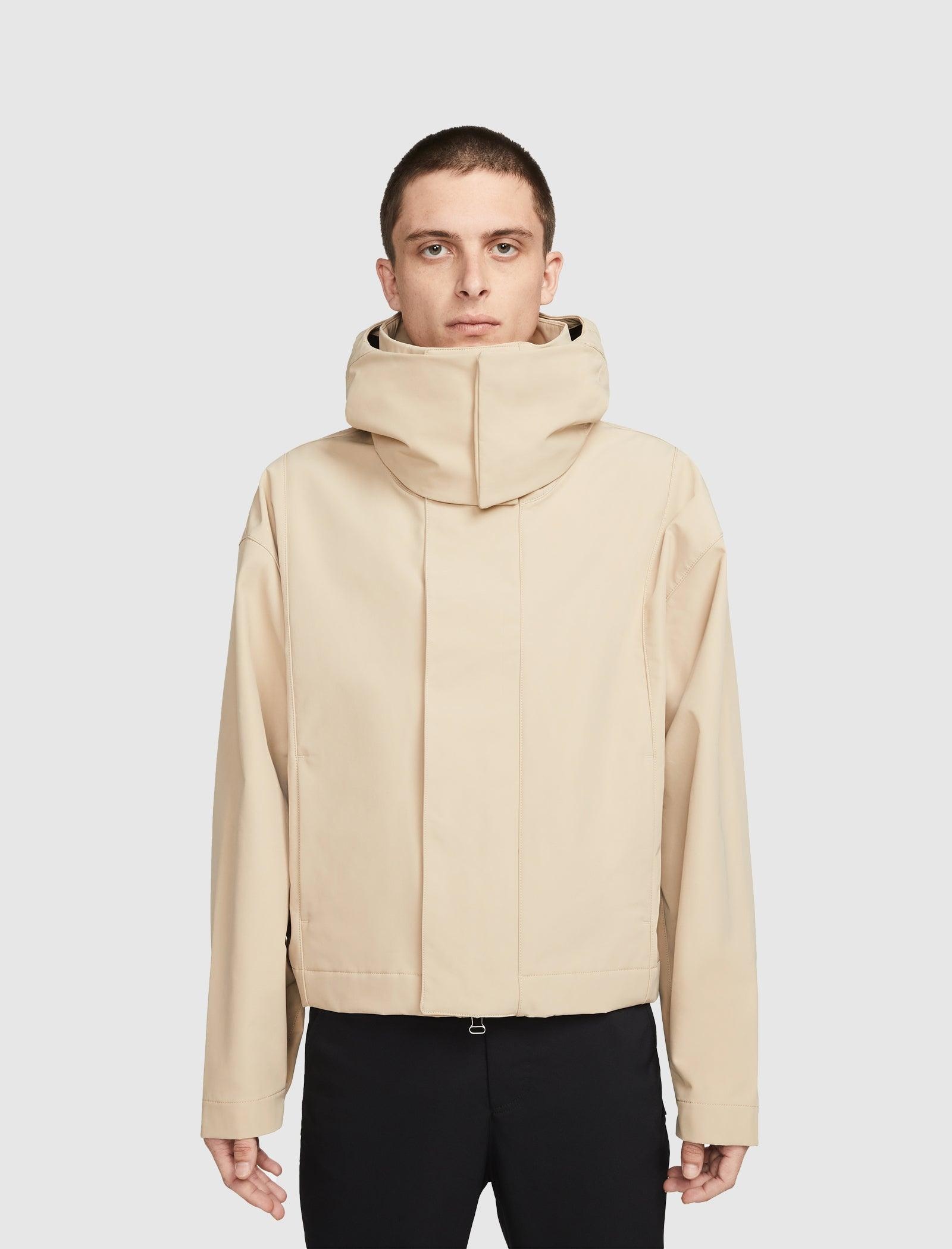 Nylon jacket. Woven outer layer. Concealed full two-way zip and snap down front closure. High neck collar. Detachable 3-piece hood. Side pockets. Woven inner liner. Snap down waist cinch. Snap down cuffs. - 87% Cotton, 13% Polyester SKU: DD9429-248