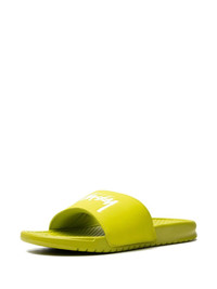 x Stussy Benassi slides Nike and Stussy are back for an updated version of the Benassi slide. Presented in a lime green hue, this model features a distinctive silhouette featuring Stussy's world-recognised wordmark on top in white. Highlights - Lime green - Faux leather - Logo-debossed strap - Open toe - Slip-on style - Branded insole - Rubber sole Imported Composition Other fibres 100%