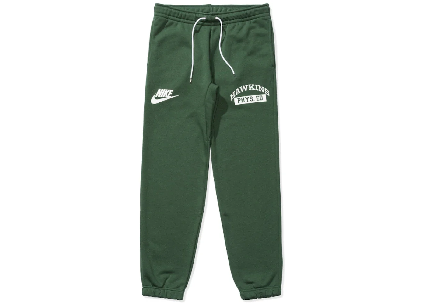 The Nike x Stranger Things Hawkins High Sweatpant Green was included in a special collaborative release between Nike and the Netflix series "Stranger Things". Made from a 100% cotton material, this sweatpants by Nike x Stranger Things have two side and two back welt pockets. The garment comes in a green color scheme. A seam pocket, an elastic ankle cuff, and white drawstrings in white are additional features. It also displays a Hawkins Phys. Ed logo and Nike Swoosh on the front, along with printed branding in white. The Nike x Stranger Things Hawkins High Sweatpant Green was made available on the 27th of June, 2019, at retail price of $65. - Season SS19 - Color Green - Release Date 2019-06-27 - Retail Price 65 - Featured false