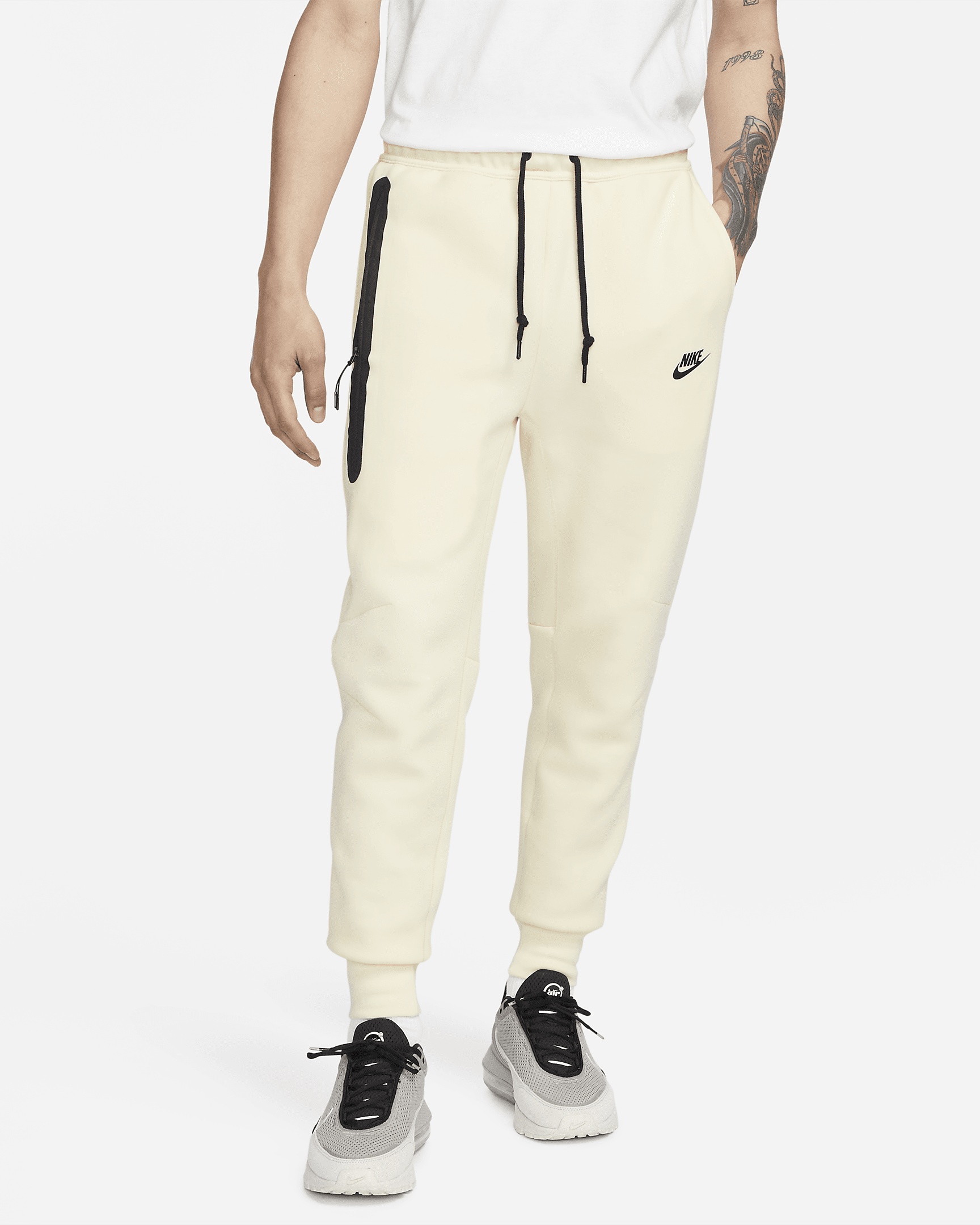 These comfy joggers bring back the signature slim fit you know for a tailored look. Our premium, smooth-on-both-sides fleece feels warmer and softer than ever, while keeping the same lightweight build you love. Tall ribbed cuffs pair with a zippered pocket on the right leg for secure storage and that signature Tech Fleece DNA. Pair them with the Tech Fleece hoodie for a uniform finish. More Benefits - Soft elastic waistband with outer drawcord provides a snug fit you can cinch up and secure. Product Details - Ribbed cuffs - Nike Futura logo at left thigh - Body: 53% cotton/47% polyester. Pocket Bag Knuckle Side: 100% cotton. - Machine wash - Imported - Shown: Coconut Milk/Black - Style: FB8002-113 SIZE & FIT Model is wearing size M and is 6′2″188cm Sm fit: sleek and tailored If you typically wear men's styles, please select your usual size. If you typically wear women's styles, please size down.