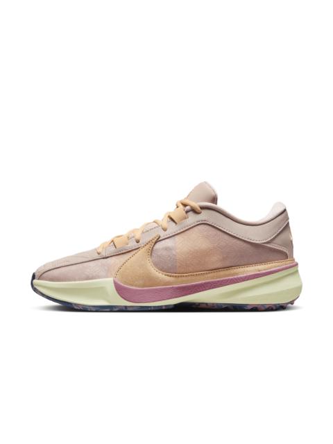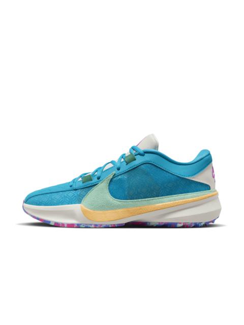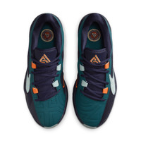 Giannis’ internal engine revs from deep within, requiring a shoe that can harness his superpower abilities. Enter the Giannis Freak 5. Stacked with stunning speed for super-quick first steps, stuffed with that sort of springy cushioning that can withstand the all-game grind, his signature shoe lets you feel like the Greek Freak. Blow past your opponent en route to the rim, while sticking with quick-twitch ball-handlers when a defensive stand decides the game. Hit the Gas:A top-loaded Zoom Air unit in the forefoot provides energy return and responsiveness, putting force into your first step so you can go from the perimeter to the rim with ease. Stay Contained:For all that force and velocity, the Greek Freak needs a design that stays with him, no matter what the defense throws at him. Our internal containment system gives you a more dynamic fit system that limits movement inside the shoe without feeling constricting. Comfort for 4 Quarters:Springy foam midsole has a responsive underfoot ride. It adds a soft, comfortable sensation to help keep you moving and energized all game long. Stick and Cut:Advanced traction in the heel enhances your on-court feel. It helps you stick to the ground for a microsecond while the other directional traction helps you dig your toe in and toe out of it. Style: DX4985; Color: Geode Teal/Purple Ink/Total Orange/Jade Ice; Size: 12.5; Gender: Male; Age Group: Adult | Nike Giannis Freak 5 Basketball Shoes in Green, Size: 12.5 | DX4985-300