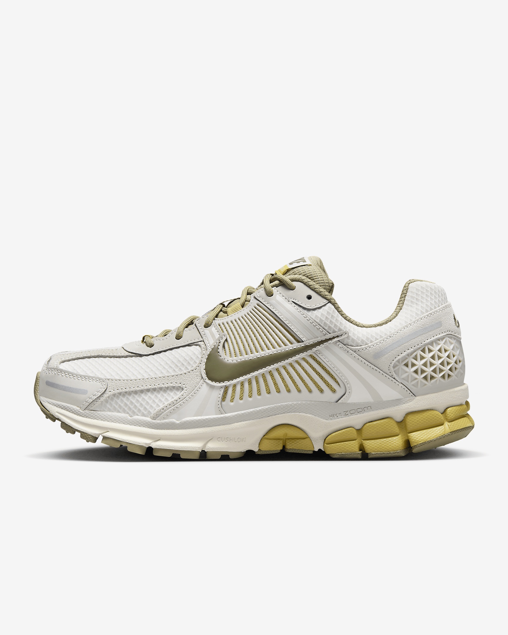Carve a new lane for yourself in the Zoom Vomero 5—your go-to for complexity, depth and easy styling. The richly layered design includes textiles, leather and plastic accents that come together to make one of the coolest sneakers of the season. Benefits - Synthetic leather on upper adds durability and structure. - Mesh panels and ventilation ports on the heel keep it light and breathable. - Snappy and responsive, Zoom Air cushioning helps provide a quick-off-the-ground sensation. - Plastic caging on side provides supportive feel. - Rubber outsole gives you durable traction. Product Details - Reflective details - Not intended for use as Personal Protective Equipment (PPE) - Shown: Light Bone/Neutral Olive/Buff Gold/Medium Olive - Style: FV0397-001