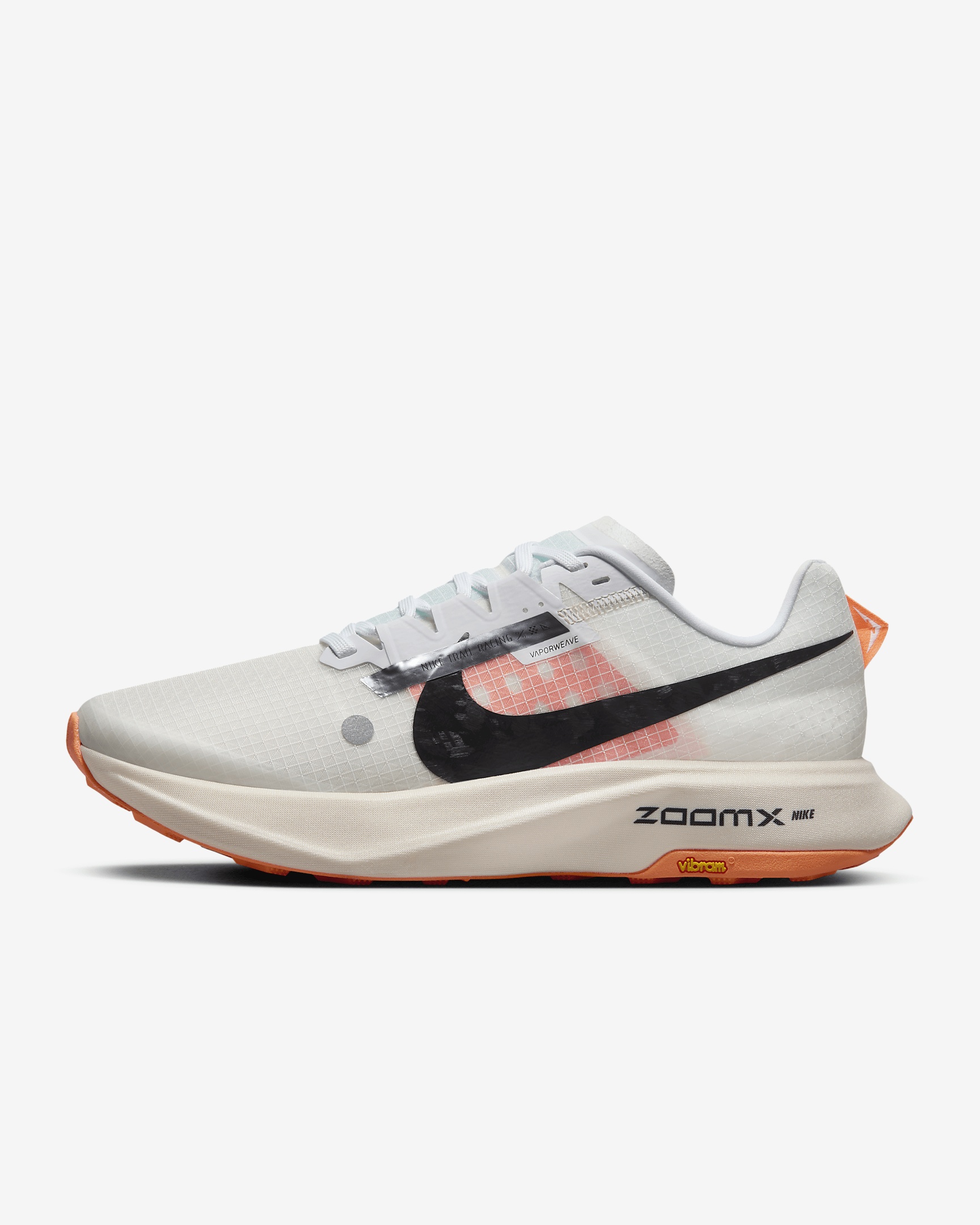 Manifest your mountainous best, when the trail ahead is skiddy and uncertain. Our all-new championship trail racing shoe melds our best speed components from the running world with what you need to plant your flag first at the finish line. It offers peak performance, sleek speed and endurance for those who want to summit nature’s playground. More Benefits - Vaporweave mesh on the upper provides breathability. - Foam midsole adds cushioning. Product Details - Weight: Approx. 300 g (Men's size 10) - Heel-to-toe drop: 8.5 mm - Not intended for use as Personal Protective Equipment (PPE) - Shown: White/Total Orange/Pale Ivory/Black - Style: DX1978-100