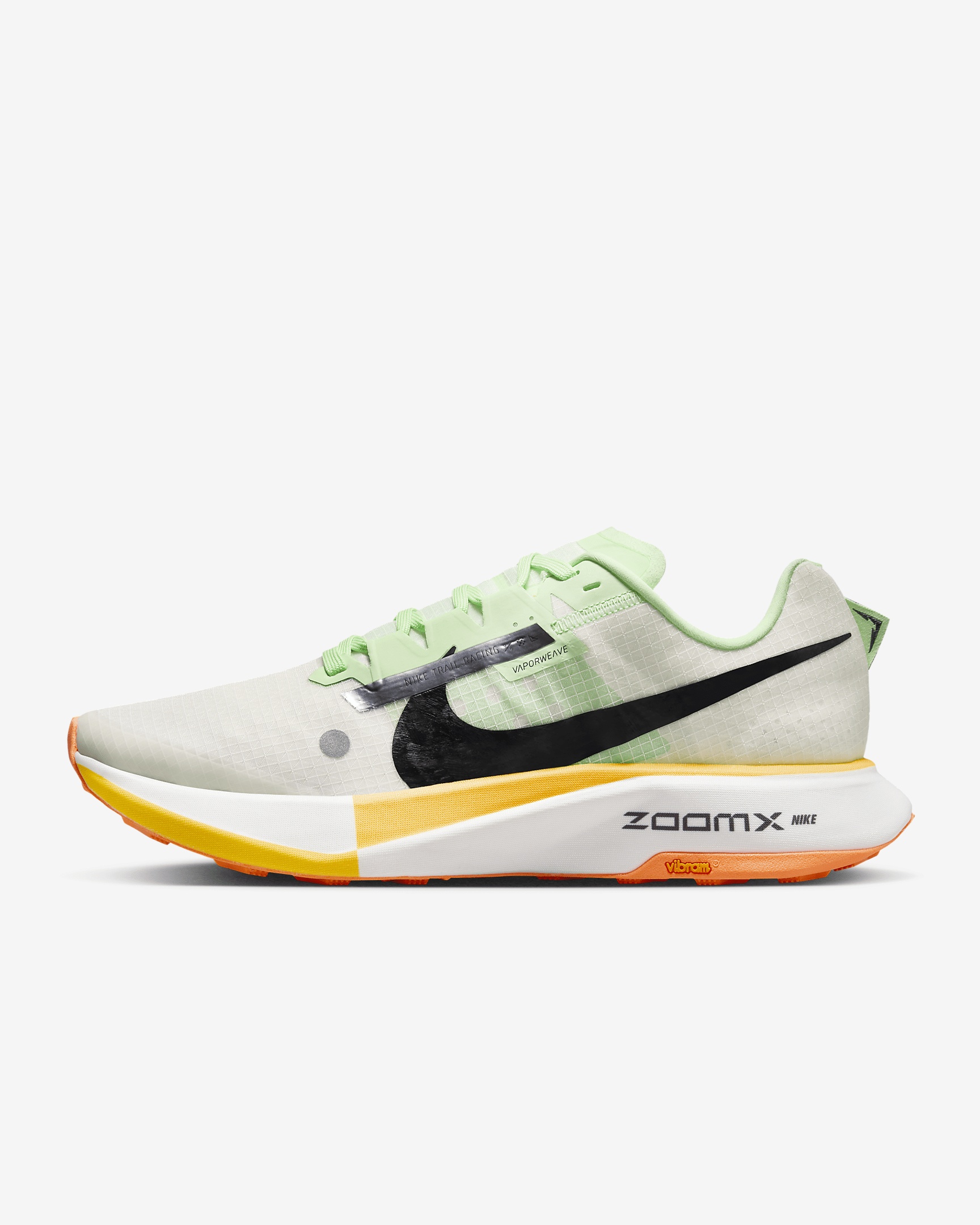 Manifest your mountainous best, when the trail ahead is skiddy and uncertain. Our all-new championship trail racing shoe melds our best speed components from the running world with what you need to plant your flag first at the finish line. It offers peak performance, sleek speed and endurance for those who want to summit nature’s playground. More Benefits - Vaporweave mesh on the upper provides breathability. - Foam midsole adds cushioning. Product Details - Weight: Approx. 300 g (Men's size 10) - Heel-to-toe drop: 8.5 mm - Not intended for use as Personal Protective Equipment (PPE) - Shown: Summit White/Vapor Green/Laser Orange/Black - Style: DX1978-102